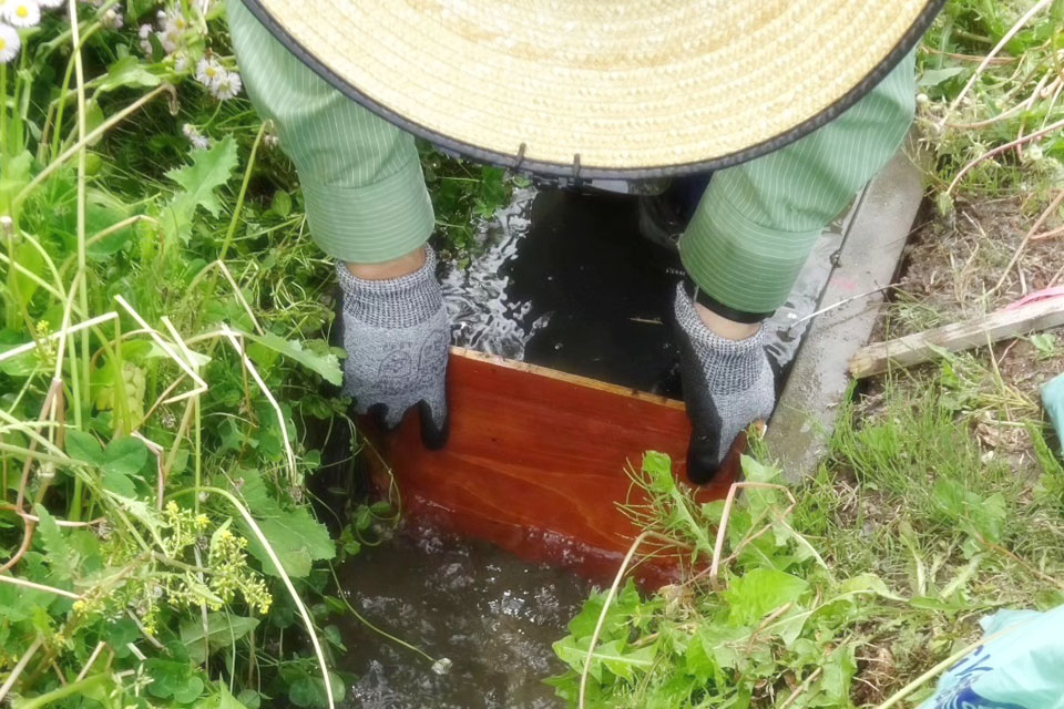 湯沢市《ユーフォー仮面田んぼ》 今シーズンはちょっと遅れて 《音の肥料作戦》 開始しました。。 この日は都合によりマネジャー氏が担当 マネジャー氏、DIYで治水工事(笑)もします。 水を張りはじめた田んぼには シオカラトンボもやってきましたよ!!