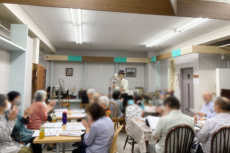 湯沢市の老舗セトモノ屋さん《カクトとみや》さん 店の奥のカフェスペースで開催の 《湯沢歌声広場》 歌の合間にゲスト出演しました。 アンコールまでいただき、ありがとうございます。 この歌声サークル、伴奏も豪華なんです!! この6人の楽士の演奏で歌を歌います。 ユーフォー仮面の登場で火がついたのは、この楽士さんたち ユーフォー仮面が演奏した曲目を即興でやりはじめましたよ。(笑) 今日の曲目リストには入っていないはずなのに。。。