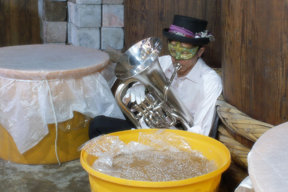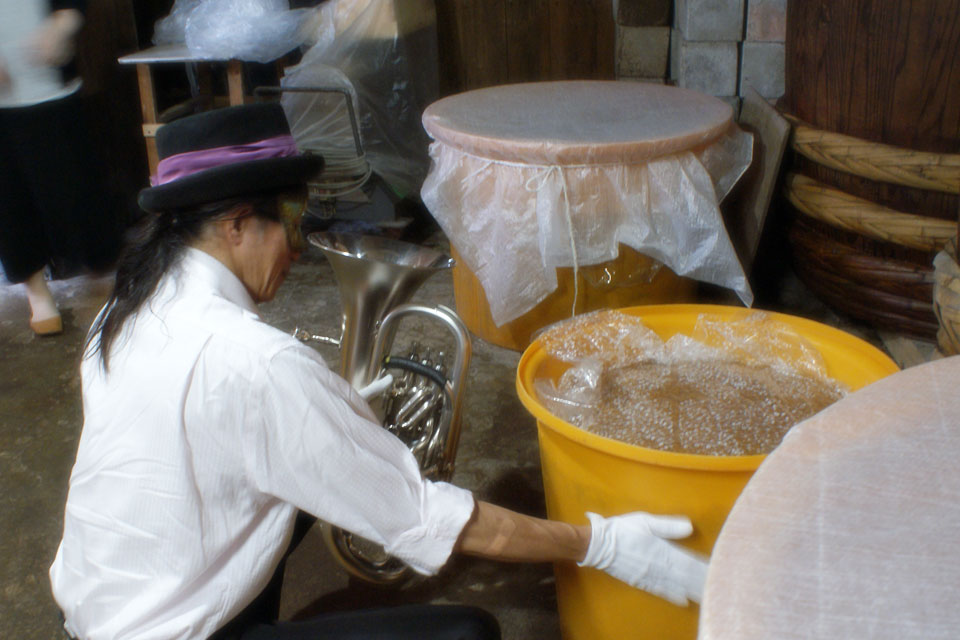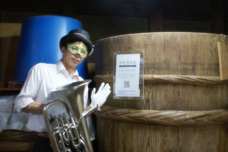 湯沢市の味噌・醤油の老舗《石孫本店》さん こちらで《ユーフォー仮面味噌》を仕込んでいただいています。 ほぼ出来上がった味噌の様子を見にいきました。 今回はユーフォー仮面米を使った初めての試みで、 約70Kgの味噌ができました。 最後の仕上げ たっぷりと音色を聴かせます。