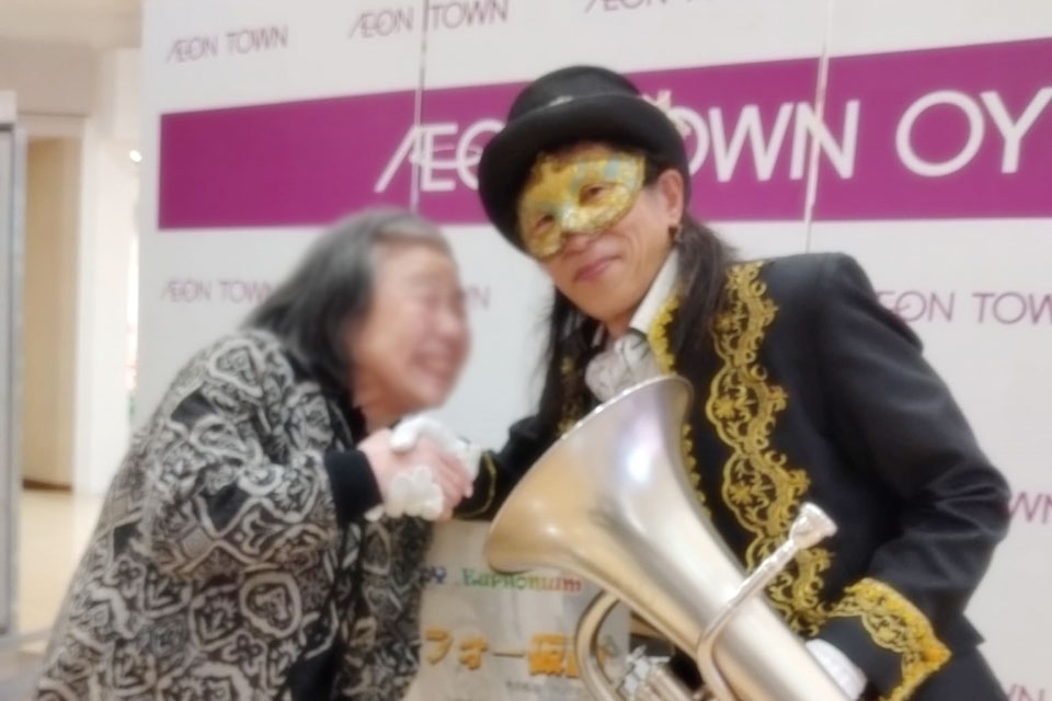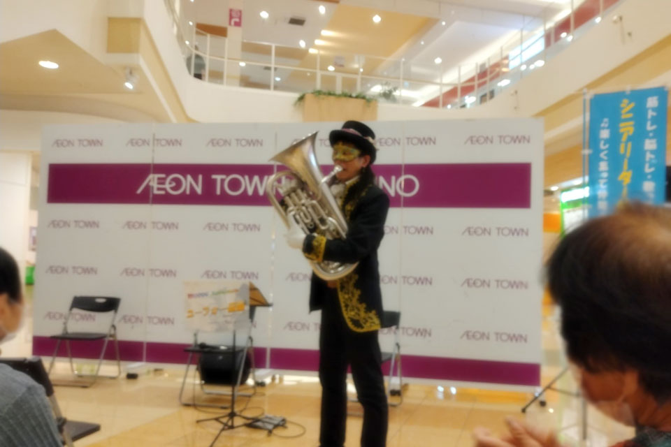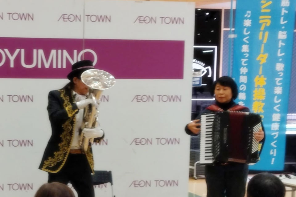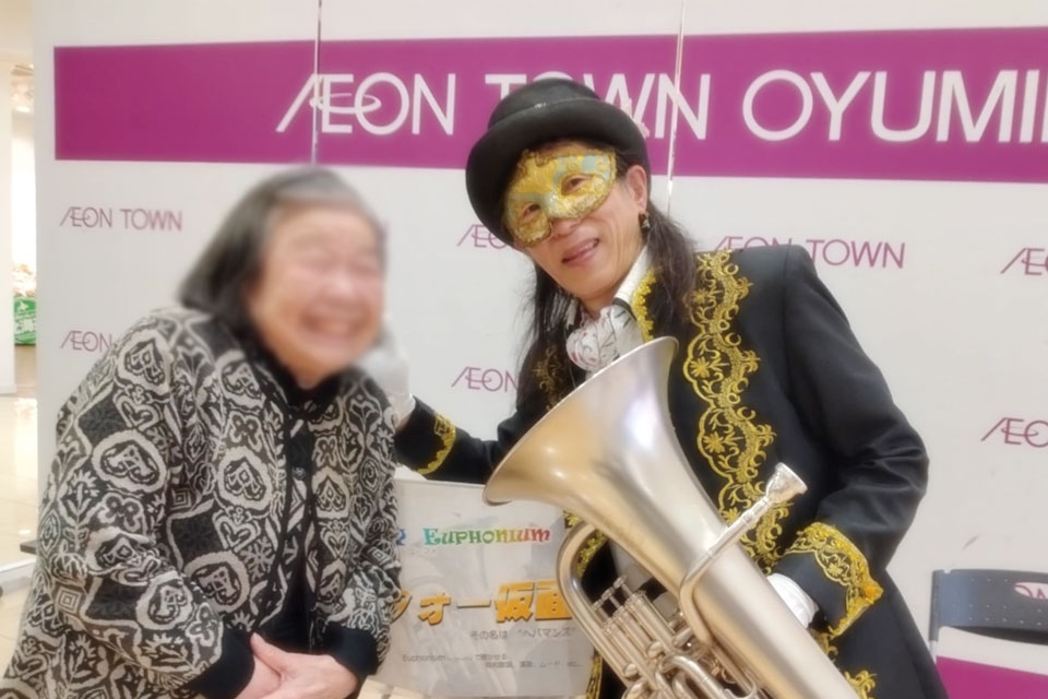 千葉市《イオンタウンおゆみ野》で定期開催の シニアリーダー体操のアトラクションにお声かけいただきました。 いつもありがとうございます!! 体操でカラダが温まったあとは、 耳と目も温めてあげましょう。 アコーディオンの「ゆりさん」にお手伝いいただいて 今回は客席うしろ側からの登場!! ゆりさん、いつもありがとうございます。 もちろん ユーフォー仮面ソロ もあります。 ユーフォー仮面ファンのお姉さん いい笑顔ですね~ (*^▽^*) 会場の皆様もありがとうございました。(*^▽^*)