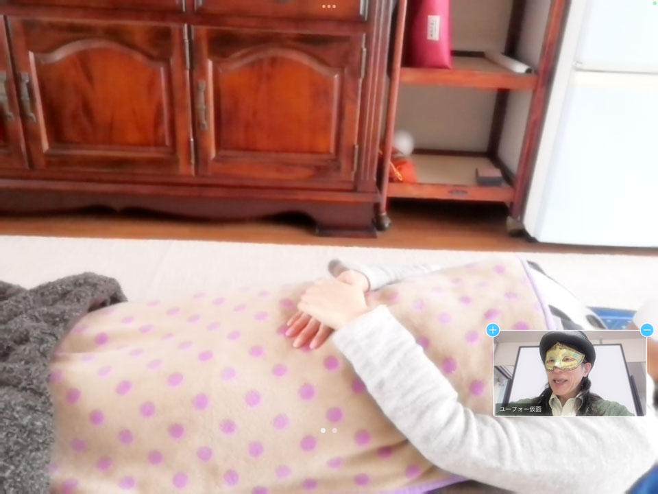 秋田県美郷町《金沢BASE》で開催の 自愛イベント 《ビューティキャンプ》で zoomリモートヒーリングを行いました。 横になっていただき リモートでチャクラを整え、お腹を温めていきます。 みんな、お手入れの途中で 顔をパックしたまま受けていただきました。(笑) 白塗り、けっこう怖いので(笑)モザイク処理しました。(≧▽≦) このピースサイン 自己肯定感、UPしたかな?? ありがとうございました。