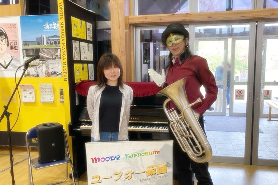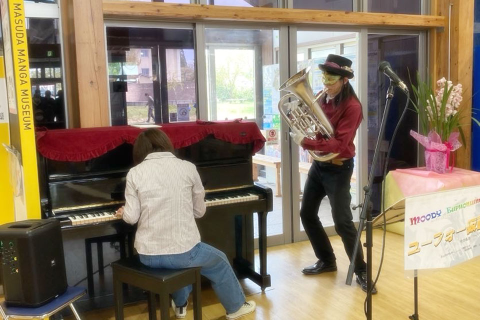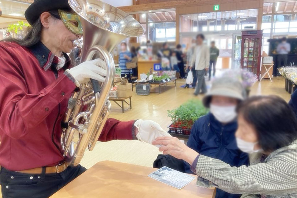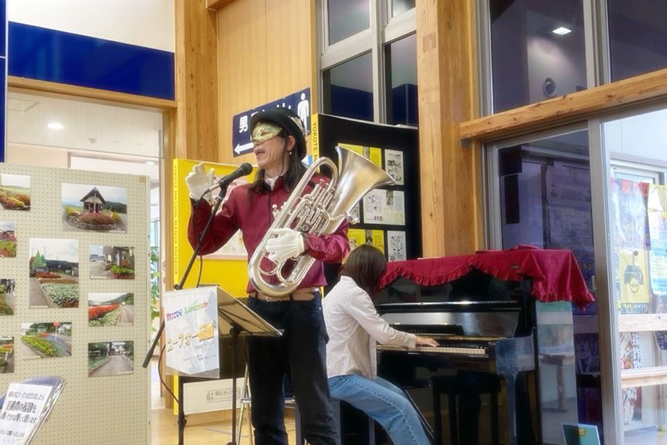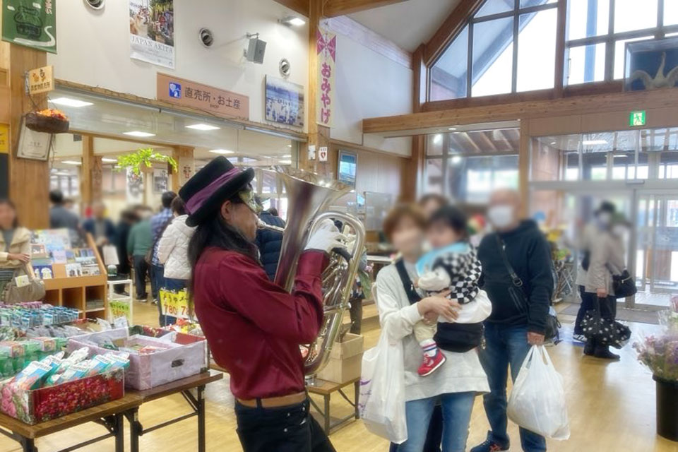 横手市《道の駅十文字 まめでらが~》さんにお邪魔しました。 《サプライズライブ》開催です。 今回はお友達の《サトちゃん》がサプライズ参戦くださいました。 ぶっつけ本番にドキドキ...💦 サトちゃんのオリジナルピアノアレンジ、すばらしい!! 2ステージ目ではかなり馴染みましたね。 吹きタッチ・吹き握手まつり いつもより多めにお客様とふれあっております。 控室でランチ!! 下膳もきちんとセルフサービスでやりますよ。(笑)