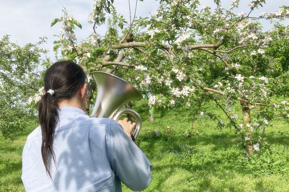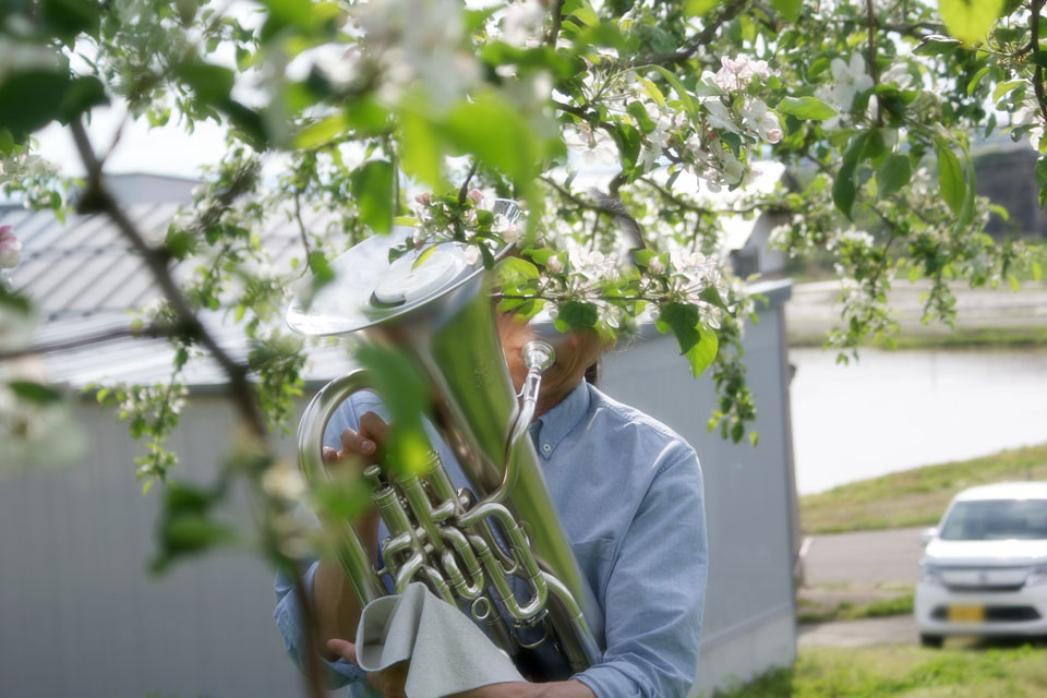 「ユーフォー仮面りんご」の花たちに《音の肥料作戦》です。