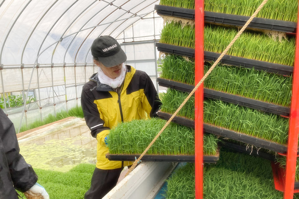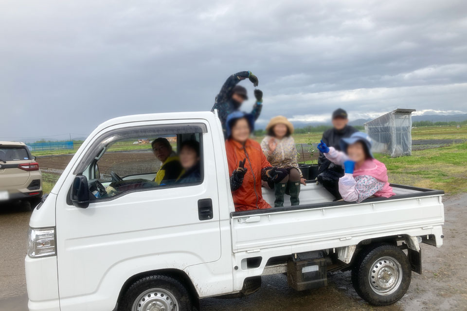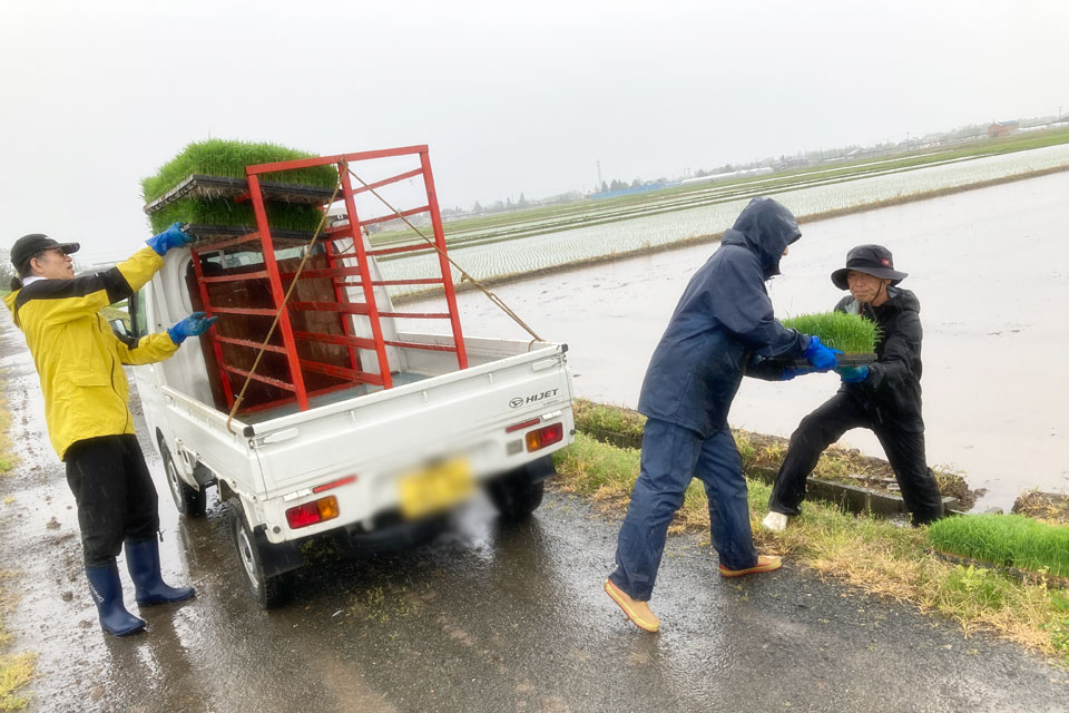 マネジャー氏 雨の中、田植えの準備(苗配り)に行ってきました。 苗代で育てた苗を、植える田んぼの脇に運んで並べて置く作業です。 専用のラックに積み込み 身長のあるマネージャー氏は高所積み降ろし要員(笑) 田んぼの脇で降ろして並べておきます。 一般的には1~3人程度で行う作業に これだけの大人数!! (≧▽≦) オヤツも賑やか (≧▽≦) 圃場と圃場の間は 人も軽トラックで移動 ※公道ではNGですよ!※ 軽トラックの荷台に乗って楽しそうな女子たち (≧▽≦) おつかれさまでした。 明日は田植え作業です。