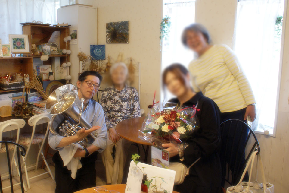 マネジャー氏 湯沢市の《カフェ Ange》さんにお邪魔しました。 ものすごく「霊性」の高いオーナーさんの作る 《スリランカカレー》をいただきに。。。 美味しい~ (≧▽≦) 話をしてるうちに『528Hz の音』の話になり オーナーさんは「528」に縁があって、住所も誕生日も「528」が入るとのこと... 『528って、今日じゃん!』と 急いでラッパを取り出し、Happy Birthday を演奏 ほかのお客さまも、お花を持って来店 ~再度 Happy Birthday! そのまま《オトダマヒーリング》をプレゼント (≧▽≦) いいPRになりました。(笑) ありがとうございました。。