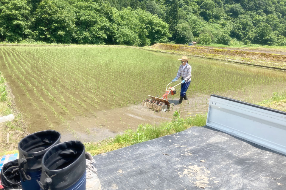 マネジャー氏、《秋田 自然&有機栽培農学校》 除草作業に行ってきました。 エンジン付き除草機は初めて。 隅っこで練習してから(笑)本番です。 田んぼの真ん中でエンジントラブル? 困って立ち尽くす マネジャー氏... 手動式の除草機に切り替えて 作業続行 あ~ぁ、またムキになって作業しちゃいました...💦 マメができちゃいました。 おつかれさまでした。