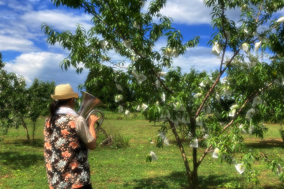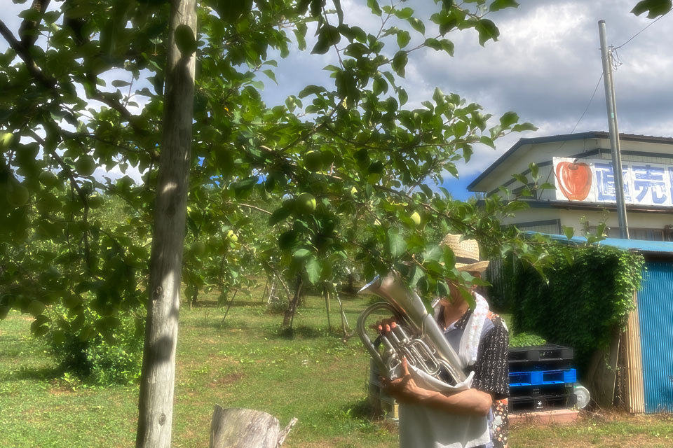 横手市《小松谷果樹園》さんにお邪魔しました。 「ユーフォー仮面りんご」たちに「音の肥料作戦」敢行 マネジャー氏が 『たまにはオラもやってみたい!』 というので 今回はマネジャー氏が担当しました。 マネージャー氏もなかなかやるな 青い実のりんごちゃんたち 赤くなるころにまた来ますよ。 大きく美味しくなぁれ!!