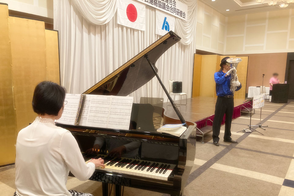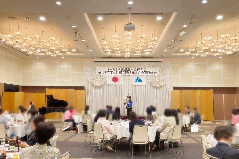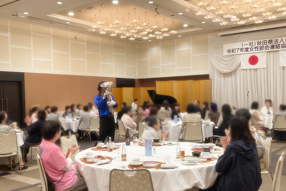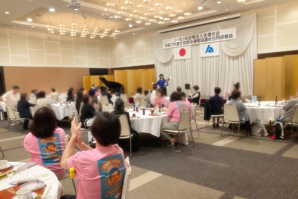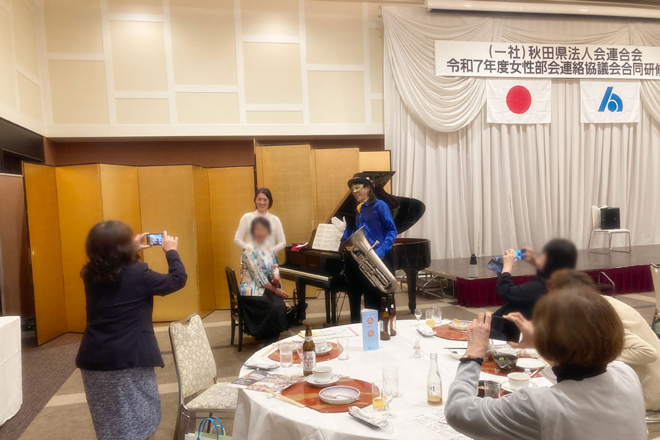 湯沢市《湯沢グランドホテル》で開催の 《秋田県法人会連合会 女性部会連絡協議会 合同研修会》 アトラクションにお声かけいただきました。 今回の相方は 鈴木智子さん ありがとうございます。 ピアノ伴奏・カラオケ伴奏を取り混ぜて演奏します。 歌も歌います。 最後は「秋田県法人会連合会」らしく 「秋田県民歌」を合唱 ユーフォー仮面も 旋律や伴奏でリードします。 ありがとうございました。 スタッフの皆さんはおそろいのピンクのTシャツで ありがとうございます。