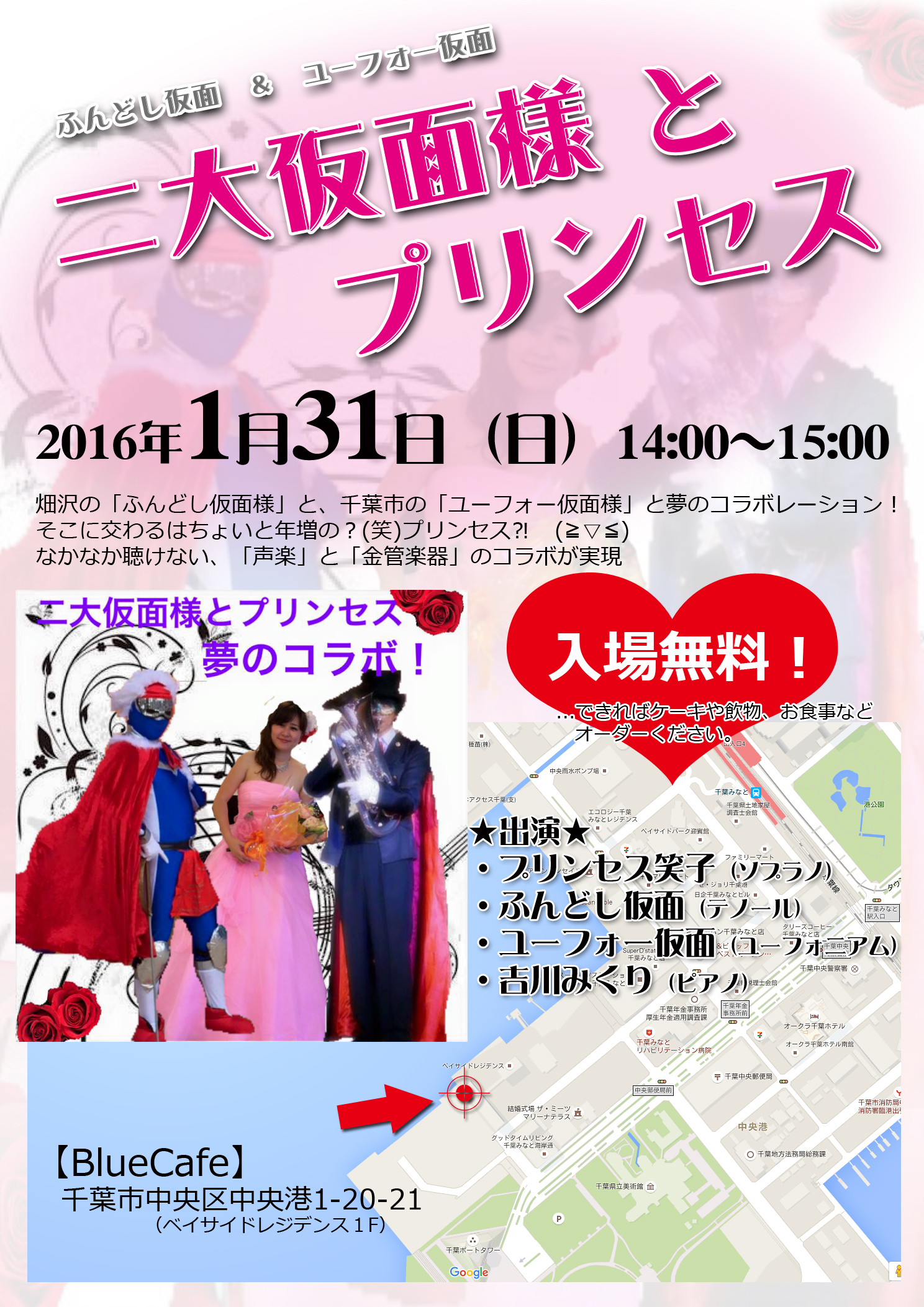 ![]() ![]() ![]() ![]() 2016.1.31(日) 13:30開場、14時開演 パティスリーAkkoのスイーツとドリンク1000円 ほか 会場:Blue Cafe 〒260-0024 千葉県 千葉市中央区中央港1-20-21 「グランスイーツブルー ベイフロントタワー」1F ※千葉ポートタワーのすぐ近くです ![]() |