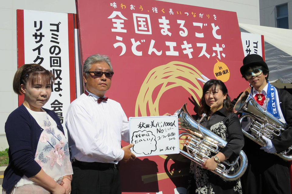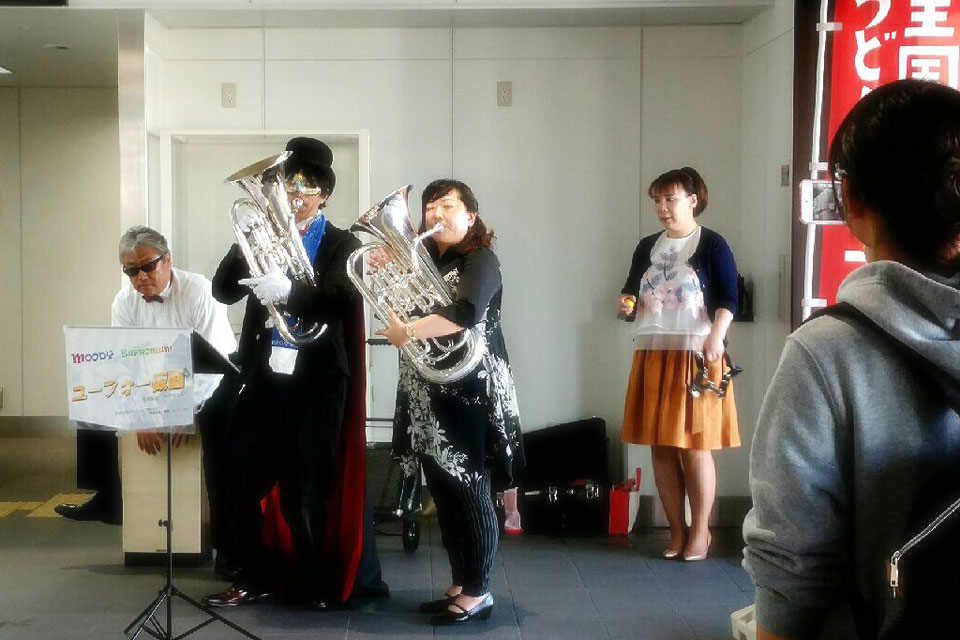 2016.10.01(土)~02(日) うどんエキスポ 2016 湯沢市役所前 「うどんエキスポ」会場脇の メインステージ --今回の出演者-- ・プリンセスゆきのん(キーボード&パーカッション) ・ちーちゃん(ユーフォニアム&パーカッション) ・ポール泉(パーカッション) ・ユーフォー仮面 ヘバマンズ(ユーフォニアム&MC) なにやら ツイッターに投稿されるという写真を撮られました。 太陽がまぶしい(>_<) そして、湯沢駅構内 電車の到着に合わせてのウェルカム演奏