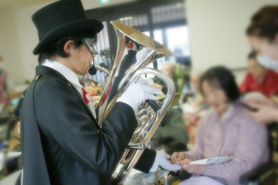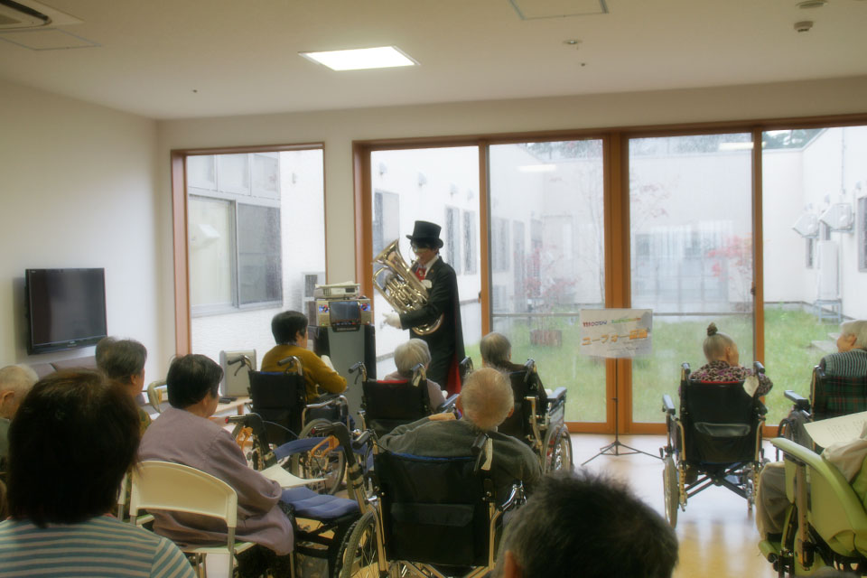 2016.10.08(土) 秋田県横手市の高齢者施設 外はあいにくの雨でしたが、皆さん元気いっぱいです! お粗末な演奏ですが、お楽しみいただけましたでしょうか? 「ユーフォー仮面と握手」で 10年元気に長生き!!