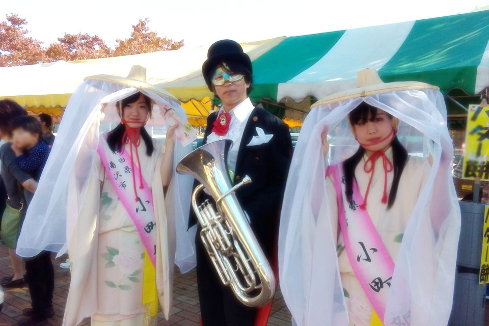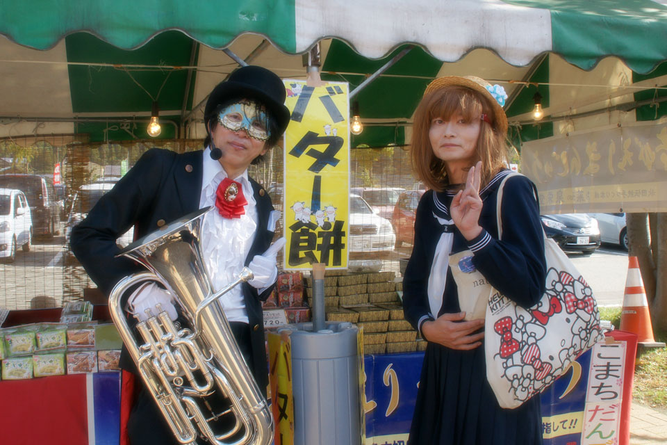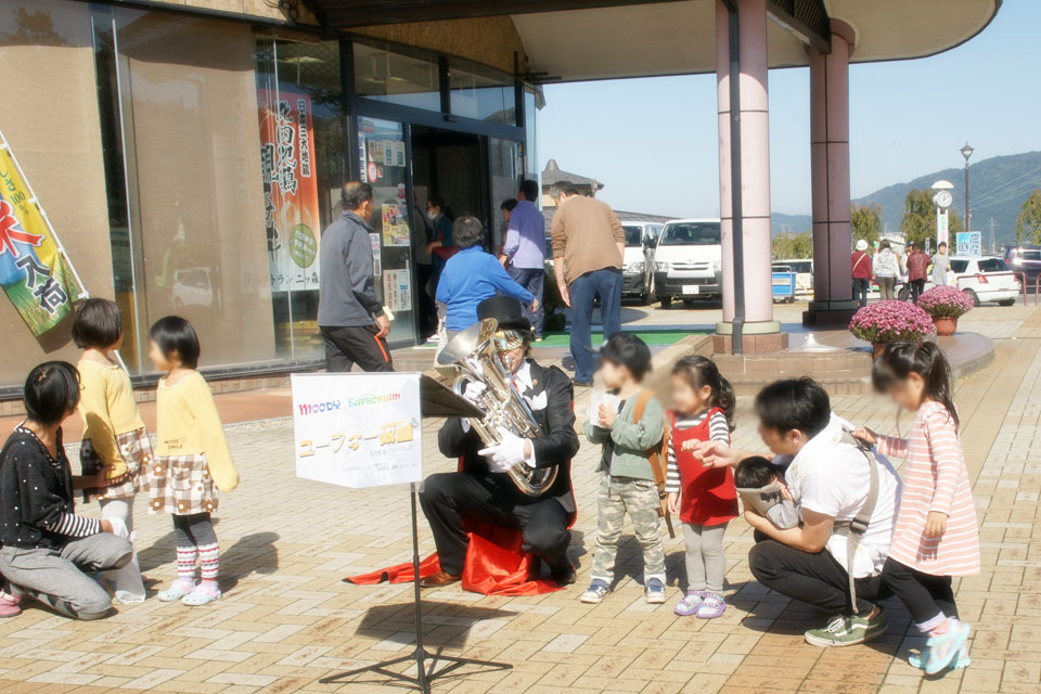 2016.10.16(日) 道の駅おがち「小町の里」 収穫祭 ちびっ子たちと一緒に「ドラえもん」を演奏しています。 先日訪問した保育園の園児さんファミリーが2組いらしていたのにはビックリ! 別々の保育園なので、まったくの偶然です。 「ジャミセリオン」さんのステージに乱入して「妖怪体操」を踊ったり・・・ ユーフォー仮面のステージに「ジャミセリオン」さんが乱入したり 「キャサリン嬢」を引っ張り込んだり・・・ やりたい放題 (≧▽≦) 小町娘さんと写真を撮ってもらったり ついでにマネージャー氏も一緒にとってもらったり(笑) ありがとうございました。 (*^▽^*)