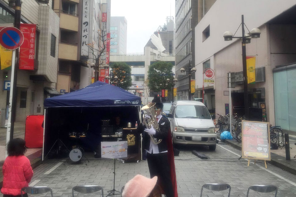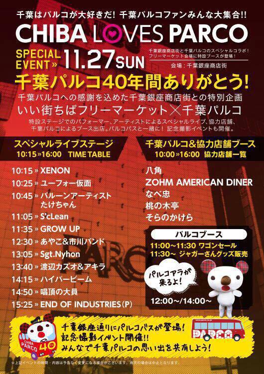 2016.11.27(日) 千葉パルコ閉店「CHIBA LOVES PARCO」 千葉パルコ前 路上特設ステージにて、千葉パルコ最後のイベント 今にも雨が降り出しそうなお天気... 急きょ「ユーフォー仮面」がトップバッターに変更... 任務は「客寄せ」 他の出演者さんが呼び込みをしてくれる中、お客様2名の状況でスタート!(笑) 最後はなんとか席が埋まりました。 よかったー (≧▽≦) その後はバルーンアートやストリートダンスのパフォーマンスで千葉パルコ最後のイベントを盛り上げました。