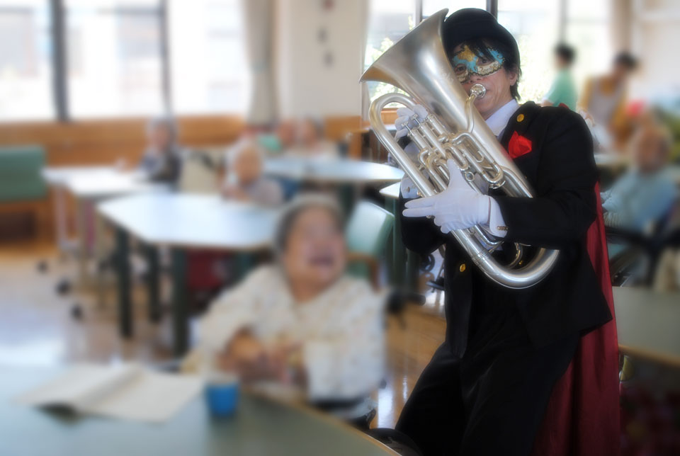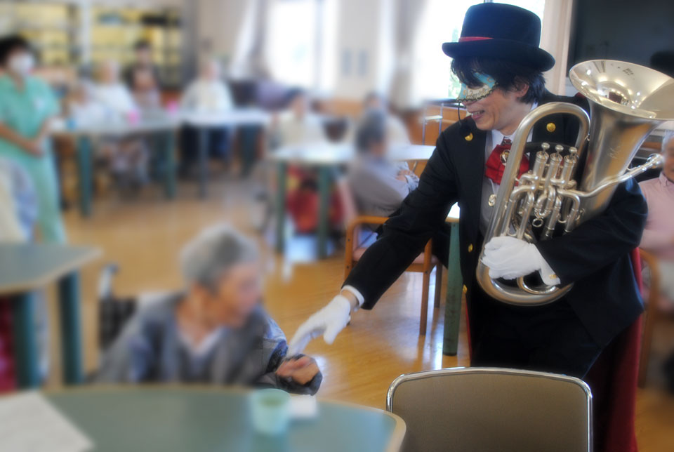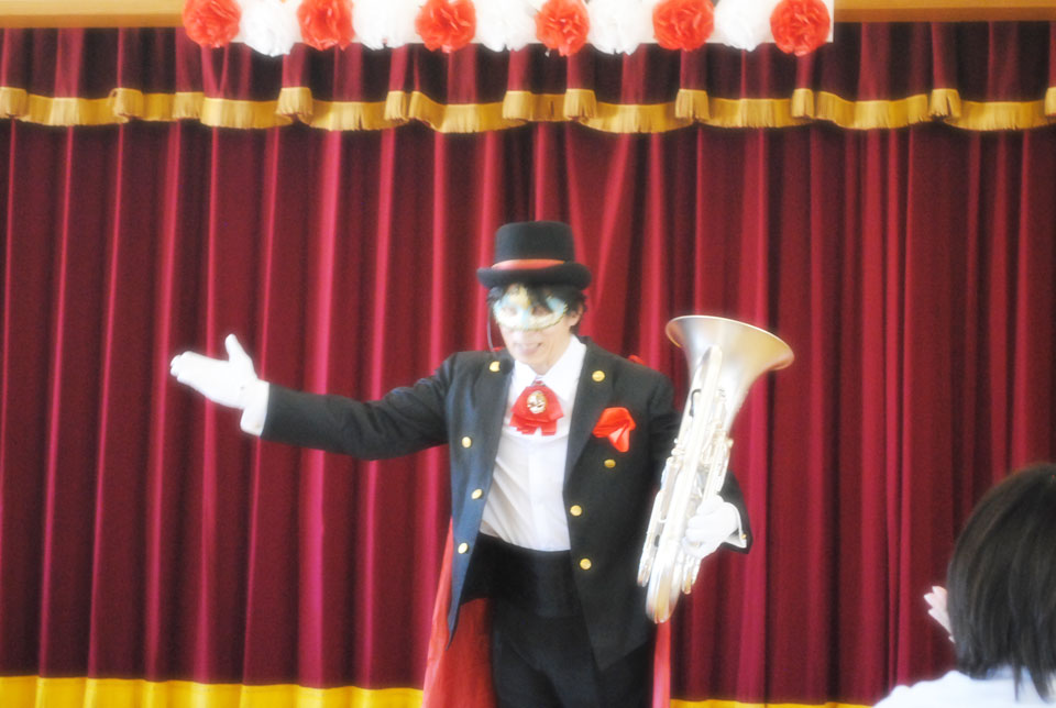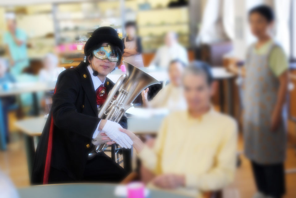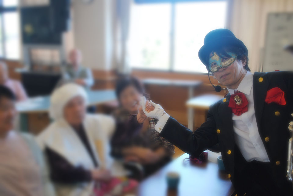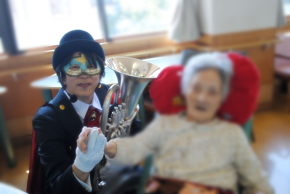 こちらは初めて訪問の施設 「敬老会」アトラクションにお声かけいただきました。 ユーフォー仮面と握手で 「10年元気に長生き!」 ユーフォー仮面と一緒に写真を撮ると 「20年元気に長生き!」 ユーフォー仮面に抱きつくと 「30年元気に長生き!」