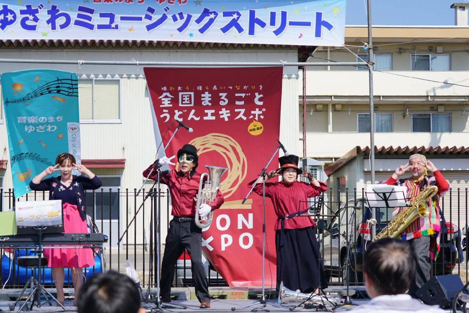 2日目は湯沢駅前で、列車の到着に合わせて「ウェルカム演奏」 同時に、会場への案内も行っています。 めッ!!! そして本日の目玉企画(笑) 今回は出演団体が多く「うどんエキスポ」会場での出番はもらえなかったので 特別に、同時イベント「クラシックカー展示」での路上ライブをさせていただきました。 ラッパはもともと電源いらないし、 アンプもバッテリー式なので、電源のないところでもパフォーマンスできるんです!! ...ものすごい人出で、食べられたうどんは「水沢うどん」のみ