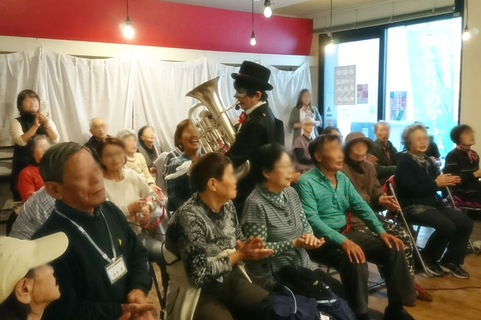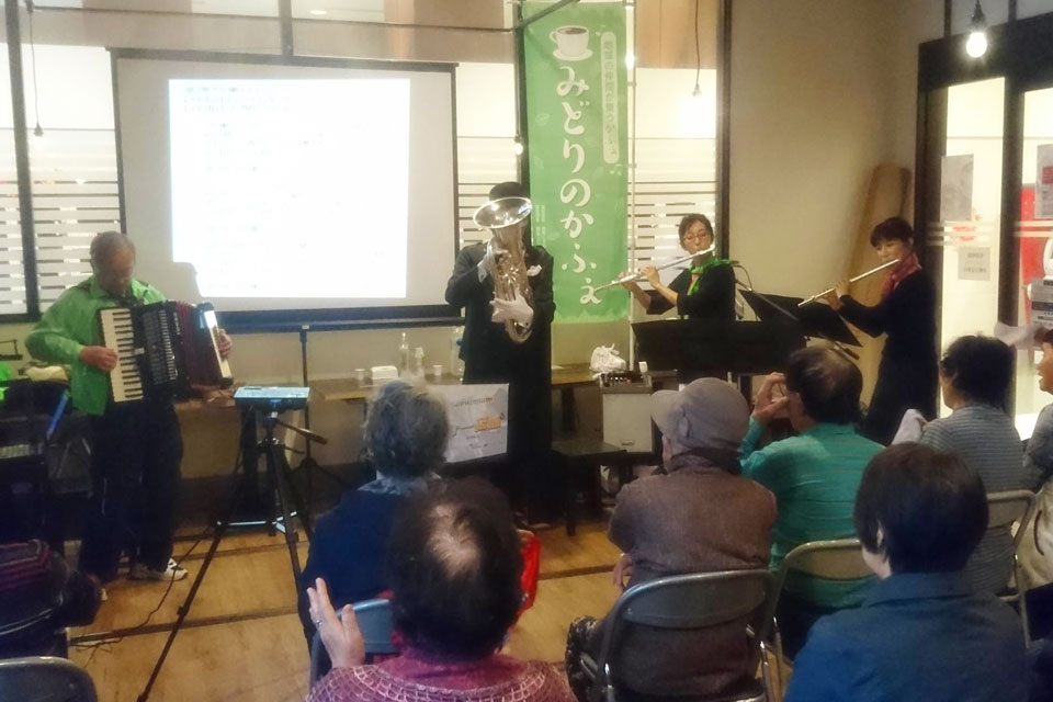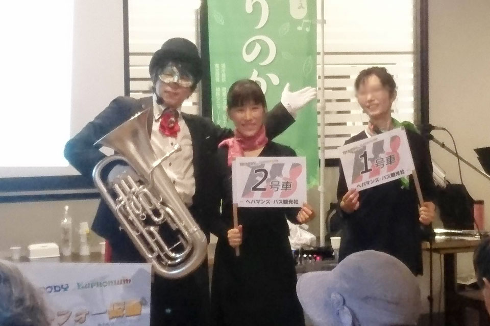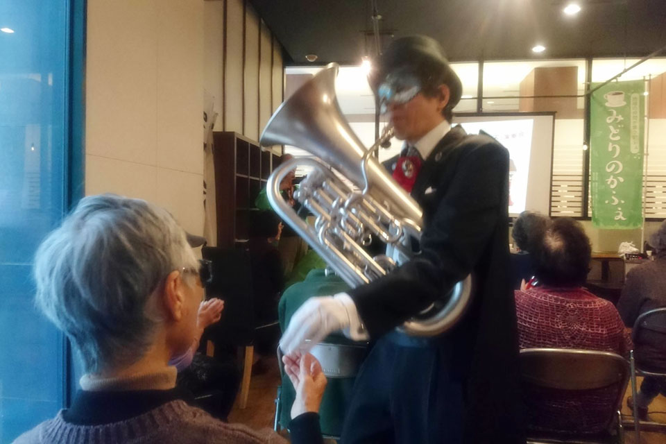 千葉市緑区、JR鎌取駅前、ピーアーク内の食堂「とき田」 お店の休業日(水曜日)にスペースを利用して、高齢者向けのカフェが開催されています。 月に1~2回、コンサートも開催されています。 カフェ、なかなかの人気のようです。 前回出演のフルートデュオ「エスプリ」さんもゲスト出演くださいました。 せっかくなので、演奏のほか「美人バスガール係」もお願いしました。 ユーフォー仮面と握手で、10年『元気に』長生き! ユーフォー仮面と一緒に写真で、20年『元気に』長生き! ありがとうございました。 またお声かけくださいませ。