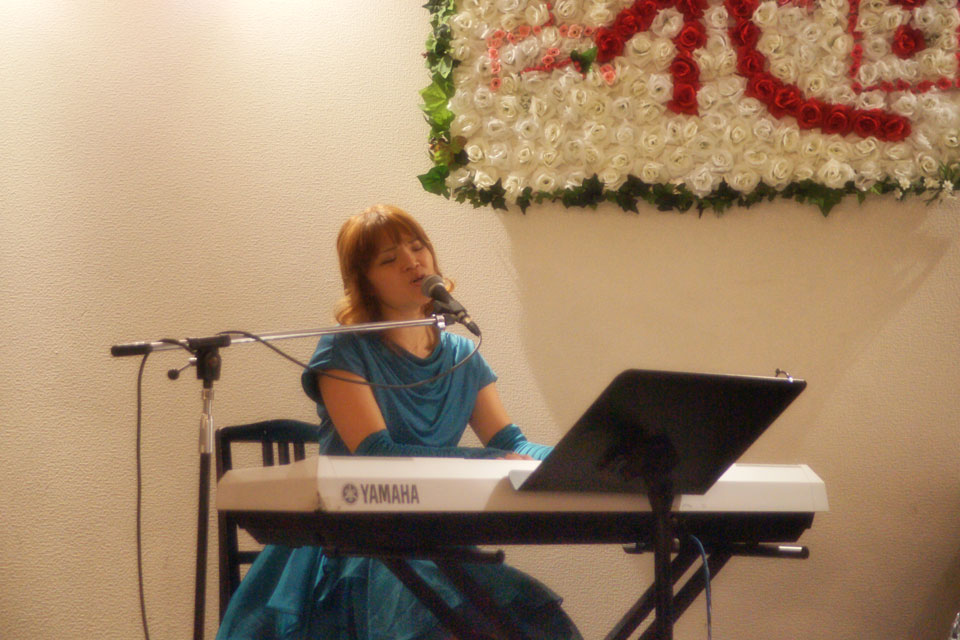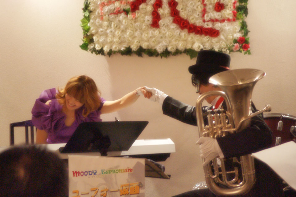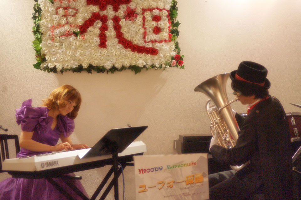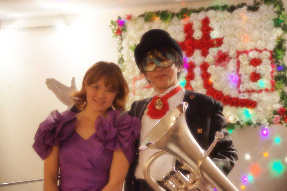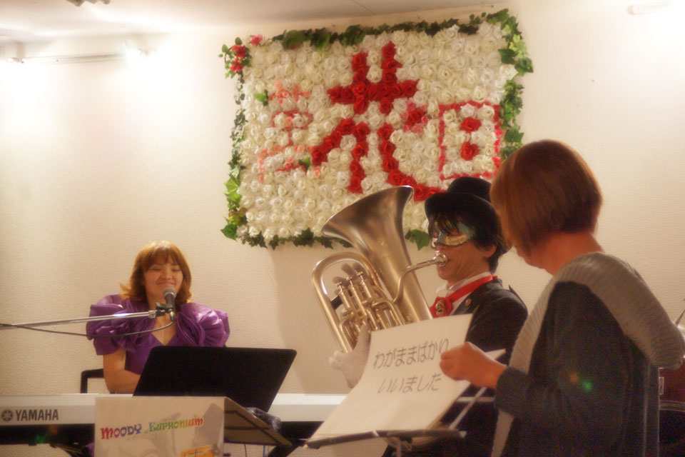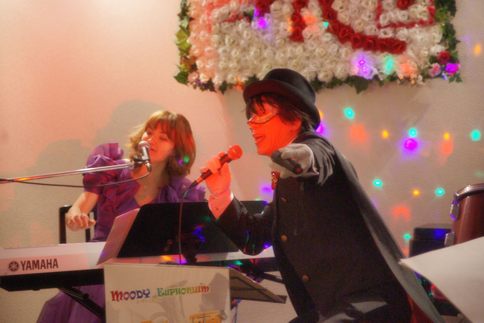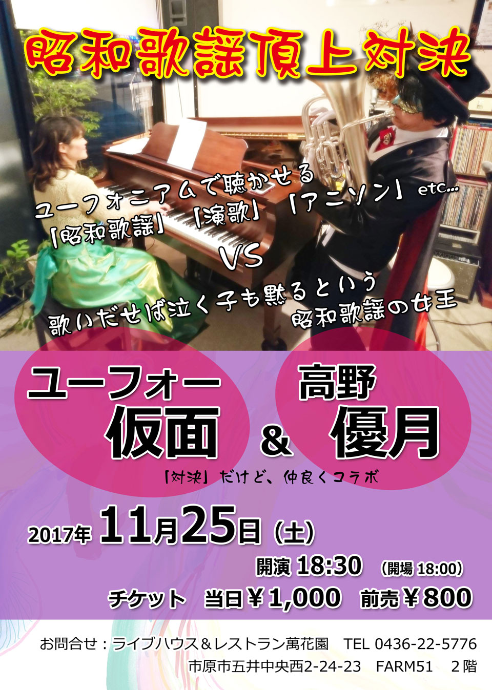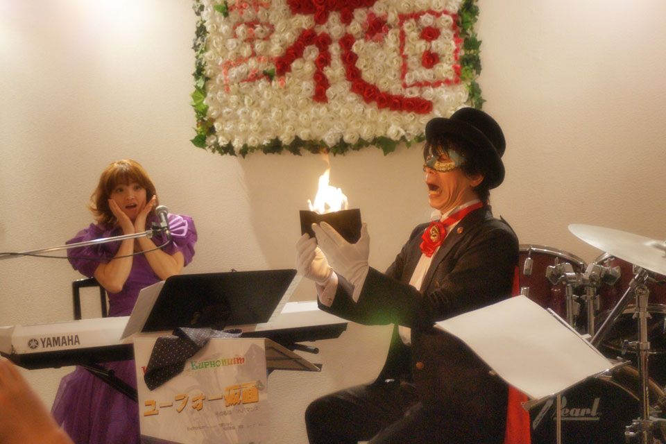 昭和歌謡頂上対決! 高野優月 vs ユーフォー仮面 市原市のライブハウス&レストラン「萬花園」で開催 それぞれのソロステージの後は、いよいよ対決ステージ!! 歌 vs 楽器 そして 楽器 vs 楽器 ユーフォー仮面、マジックデビューか!? 禁断の 歌 vs 歌 ♪ 沈む夕日に 真っ赤っかに染められて~ ♪