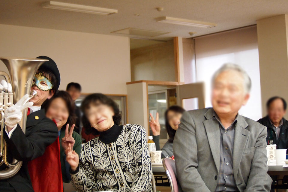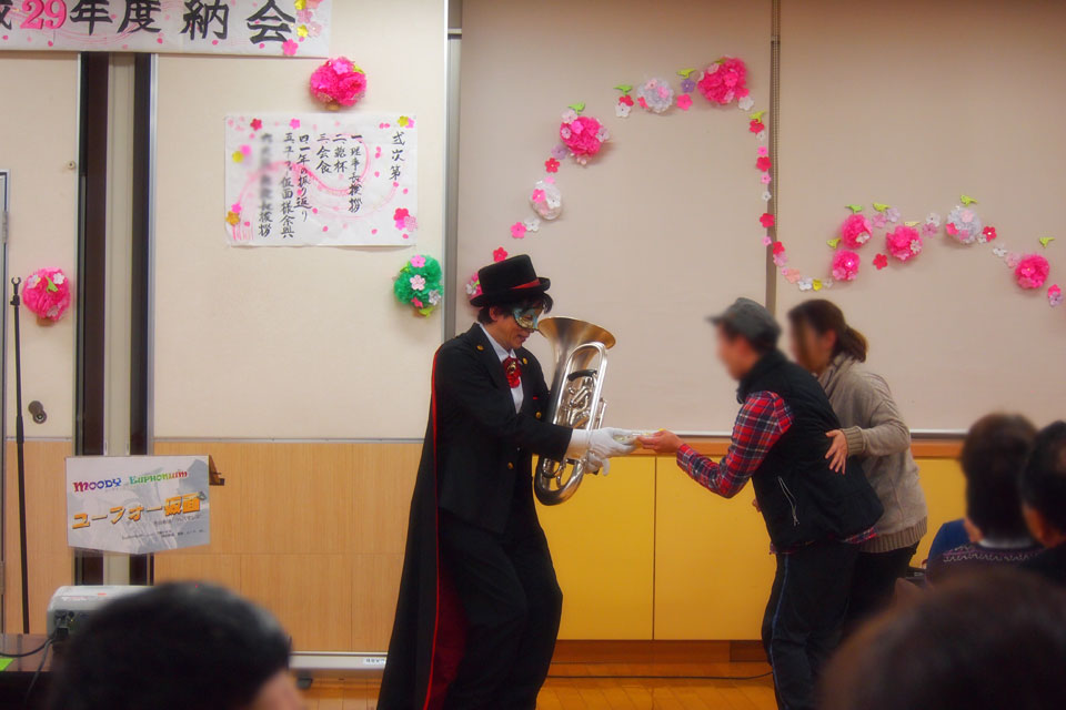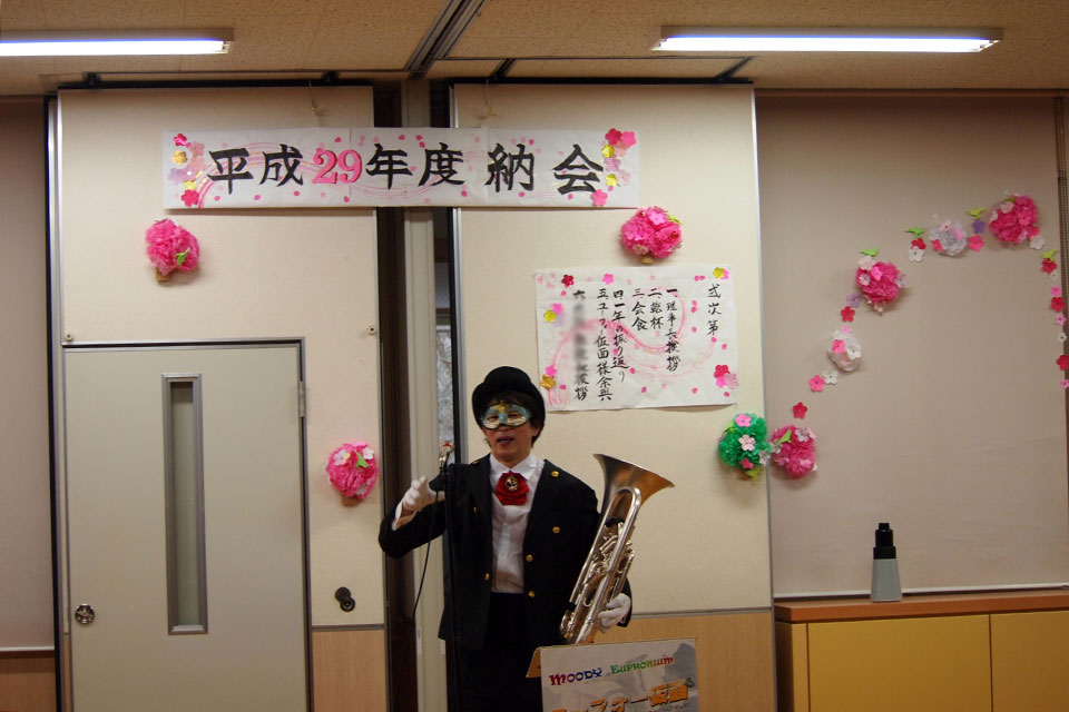 佐倉市内の福祉施設、納会のアトラクションにお声かけいただきました。 ありがとうございます。 恒例の吹きながら握手!! 記念品までいただいちゃいました。 ありがとうございます。 ぜひまたお声かけくださいませー