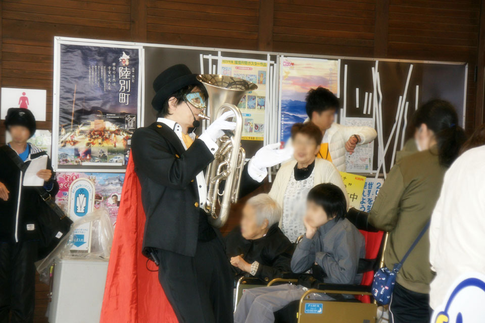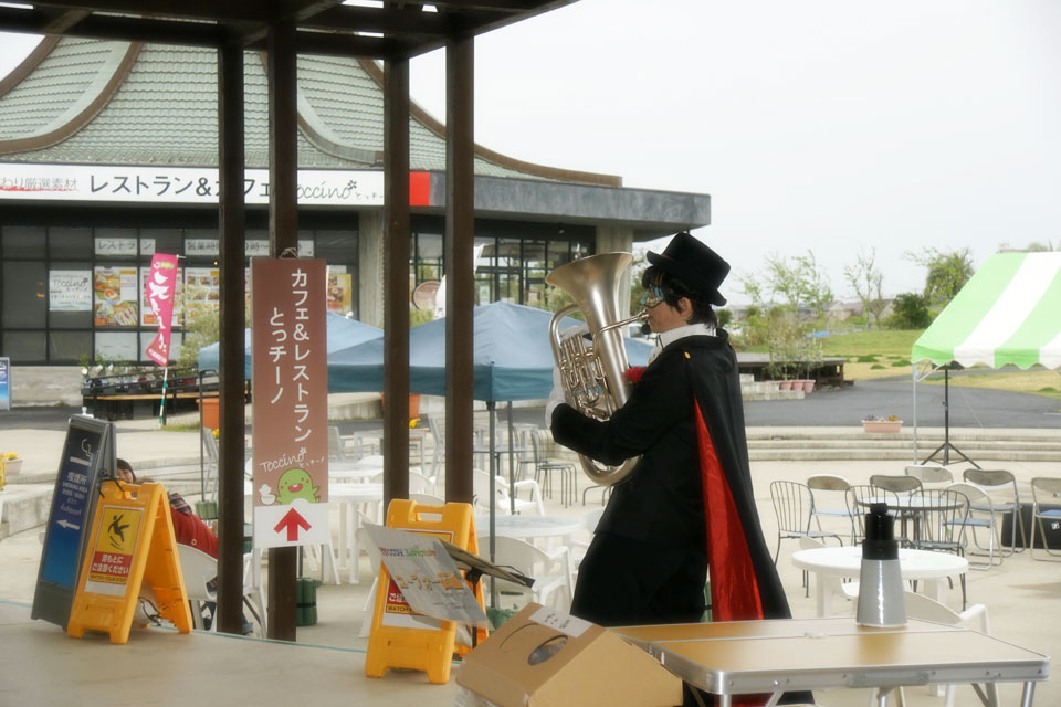 東金市の道の駅「みのりの郷東金」大創業祭にお邪魔しました。 演奏前から風が強かったんですが、ユーフォー仮面の演奏途中から、まさかの暴風雨!! 譜面台は倒れるわ、乗せていた iPad もすっ飛んでいくわ、楽器も服もびしょ濡れになるわ、、、 ユーフォー仮面、ふだんの行いがどれだけ悪いんだっ! ...って感じです。 屋根の下に異動して演奏再開 そうしているうちに雨も上がり、ゆるキャラと、見物に来てくれたお客様と写真撮影(笑)