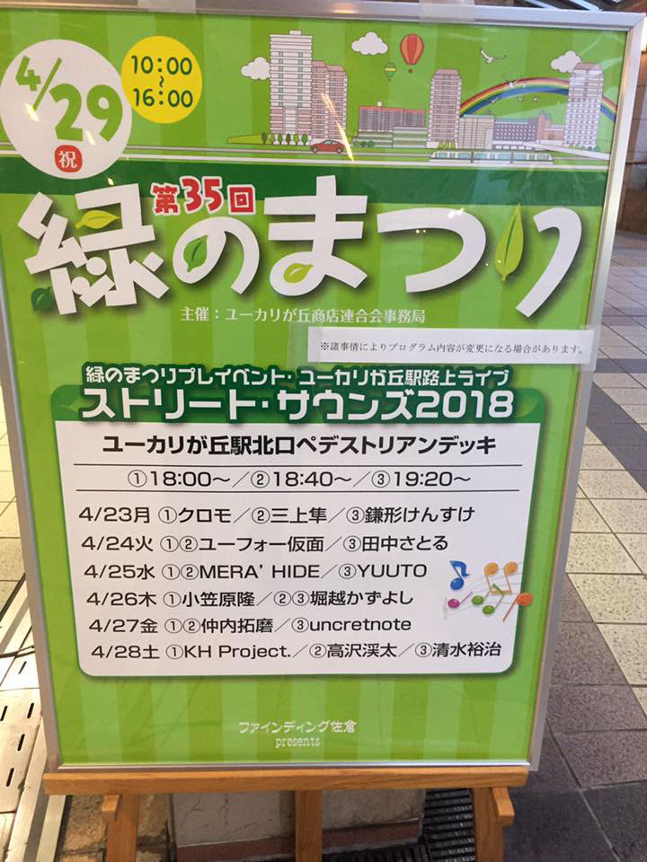 佐倉市 ユーカリが丘駅前にお邪魔しました。 4/29(日)開催の「緑のまつり」 プレイベントとして路上ライブが企画されました。 雨のため、今日は屋根のある場所で開催 6晩連続で開催されます。。。 企画の「ファインディング佐倉」 代表の渡邊氏 ありがとうございました。