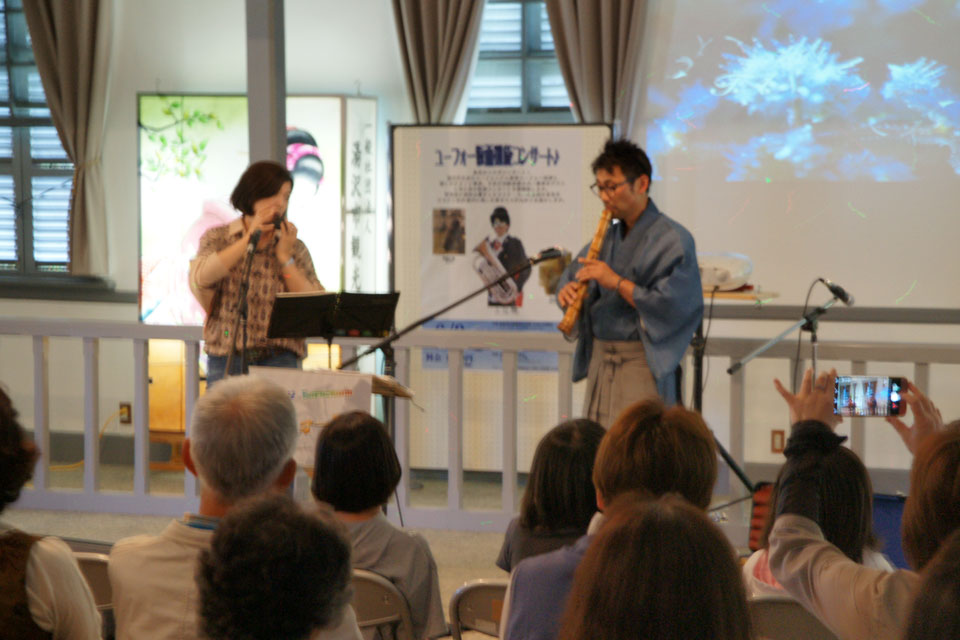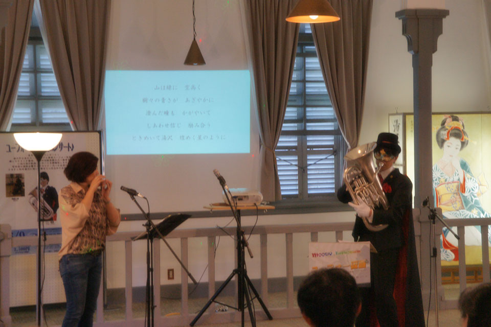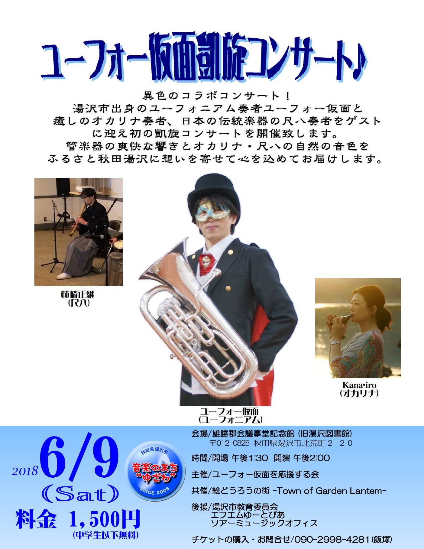 湯沢市「雄勝郡会議事堂記念館」 《ユーフォー仮面 凱旋コンサート》を開催しました。 ...なんにも手柄をたてていないのに「凱旋」なんて... ま、いいか (;^ω^) これから手柄をたてるようにがんばります。 ゲストの オカリナ奏者「Kana-iro」さま、尺八奏者「柿崎」さま それぞれソロステージ、そしてコラボステージ 湯沢市民歌も披露。 最後は全員で「ふるさと」を合唱しました。 奏者&スタッフ おつかれさまでした。