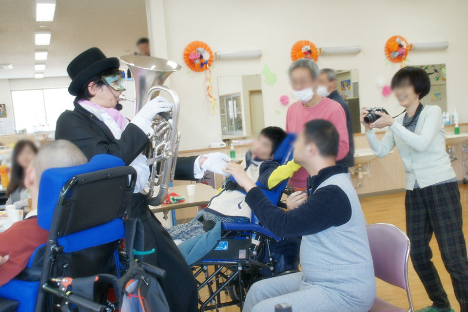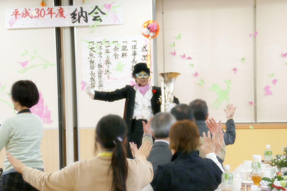 佐倉市の福祉施設「納会」アトラクションに出没しました。 去年に続き、2回目の訪問です。 ありがとうございます。 今回も、吹きながらお客様の近くに行きますよ!! アクションの練習 (*^▽^*) 記念撮影 お隣のお姉さまに帽子とられました(笑) ユーフォー仮面に抱きつくと30ね... お姉さん、最後まで聞かずにガバっ! ときました。(笑)
