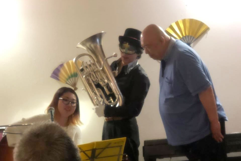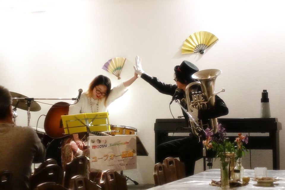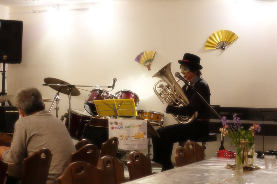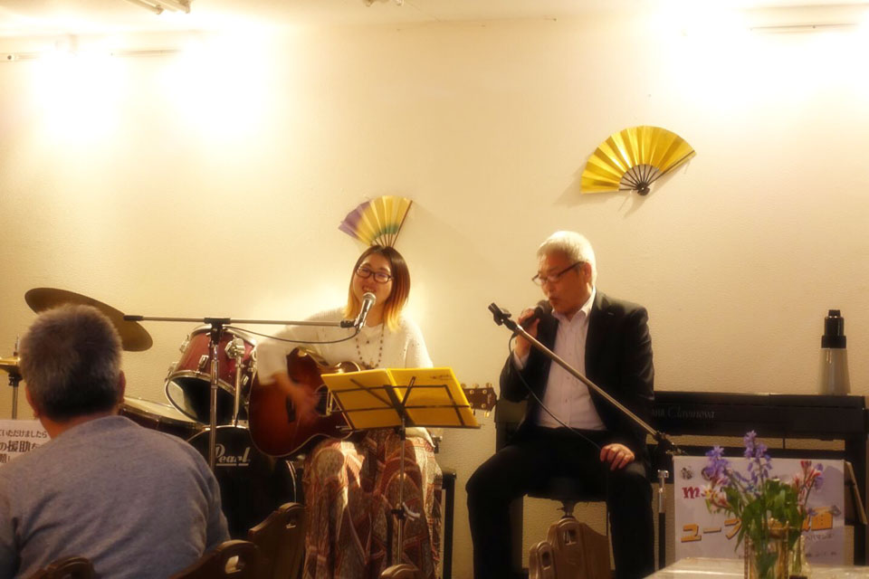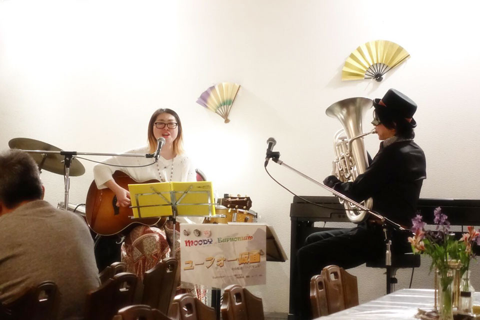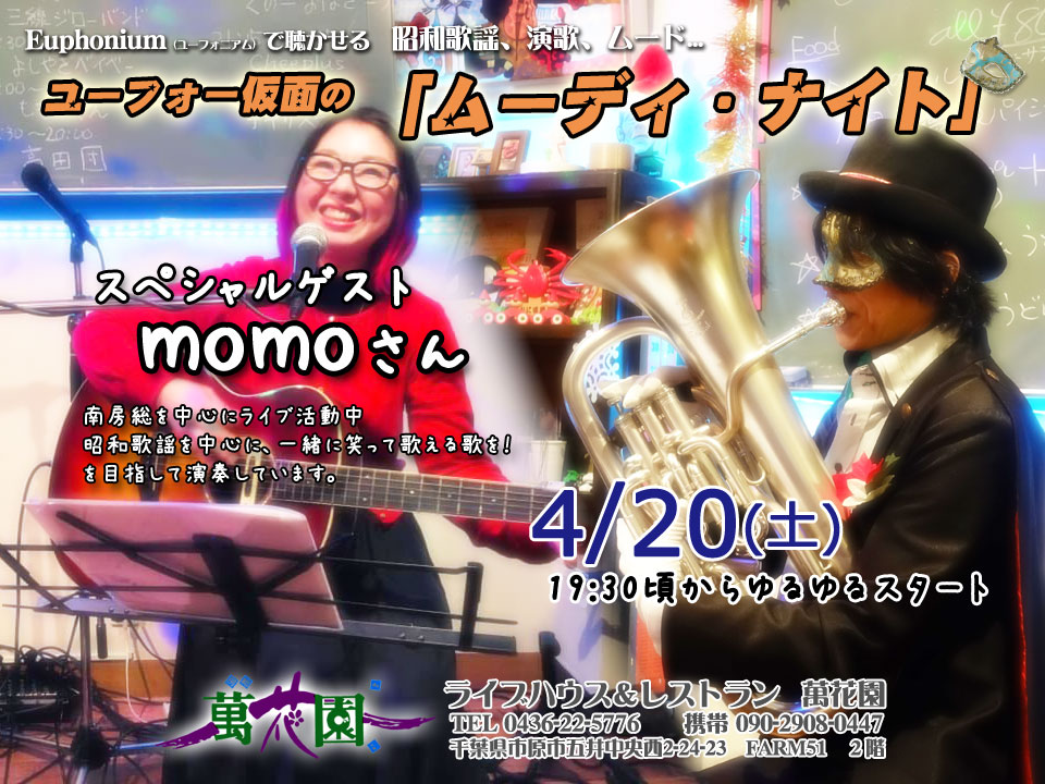 隔月で開催の 《ユーフォー仮面のムーディ・ナイト》 今回は、ギター弾き語りの「momo」さんをゲストに開催しました。 それぞれのソロステージ お客様参加もあり!! (*^▽^*) momoさんに 急に曲目を振られ、慌ててコードを確認してるところ (;^ω^) 右側は次回ゲスト予定の ロッキーさん コラボステージ じつは初対面! なんとかなりました。(たぶん) ありがとうございました。