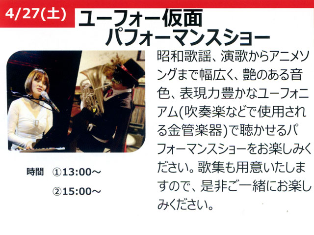 千葉市 検見川浜駅前 《イオンスタイル検見川浜》にお邪魔しました。 リピーターのお客様もたくさん! ありがとうございます!! 客席にフルートらしきものを持ったお姉さんを発見! その場でスカウトしました。 いつも演奏しているという「糸」を一緒に演奏しましたよ。 画像は、譜面をのぞき込んでキーを確認しているユーフォー仮面(笑) これでテキトーにハモリを入れたりします。 今回もたくさんのご来場、ありがとうございました。