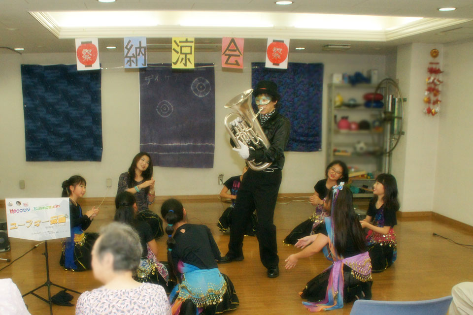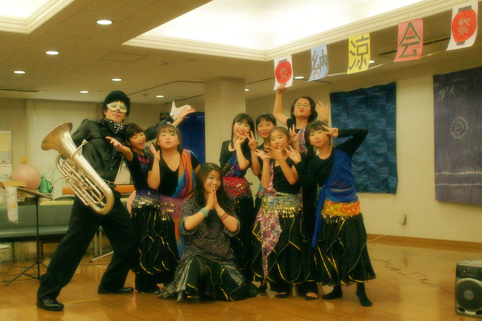 千葉市美浜区の高齢者施設にお邪魔しました。 今回のミッションは、『納涼会終了後の送迎待ち時間』のパフォーマンス いわば、裏プログラムです。(笑) 本プログラムで出演の ちびっこベリーダンスチーム 《ぷっちんべりんず》の皆さんが華を添えてくださいました。 事前の打ち合わせはナシ それでも華麗に踊ってくれる、この子たちはスゴイ!! ...あ、オトナもひとりいらっしゃいました。(;^ω^) 施設長さんと、ジャグリング・パフォーマーの後藤さんにも入っていただき 記念撮影