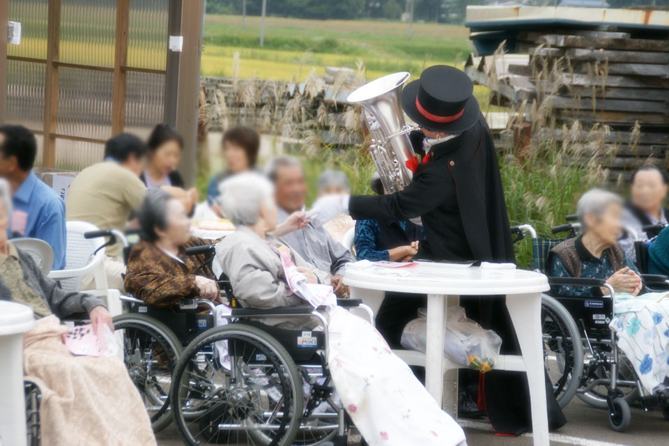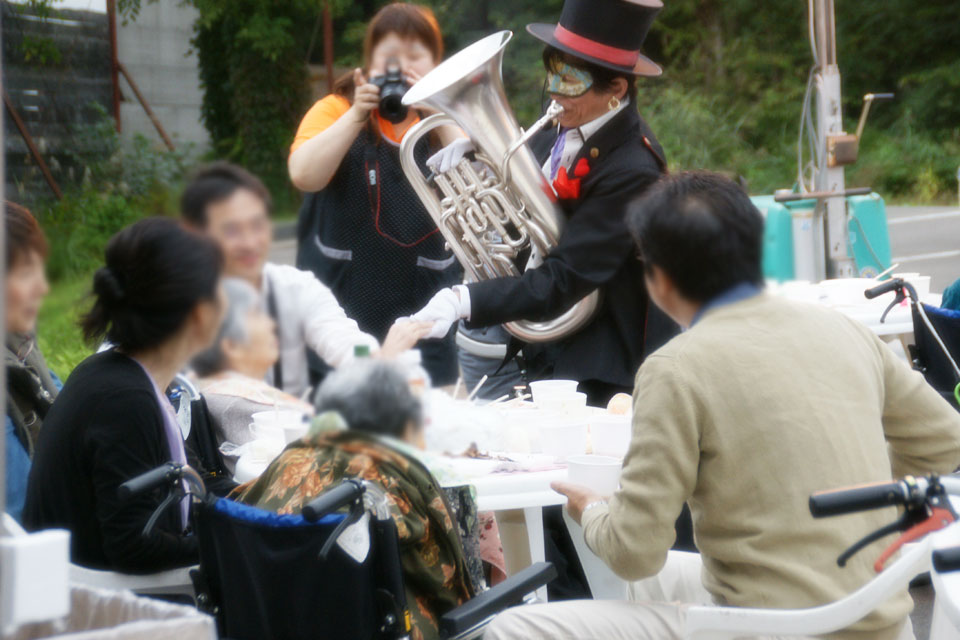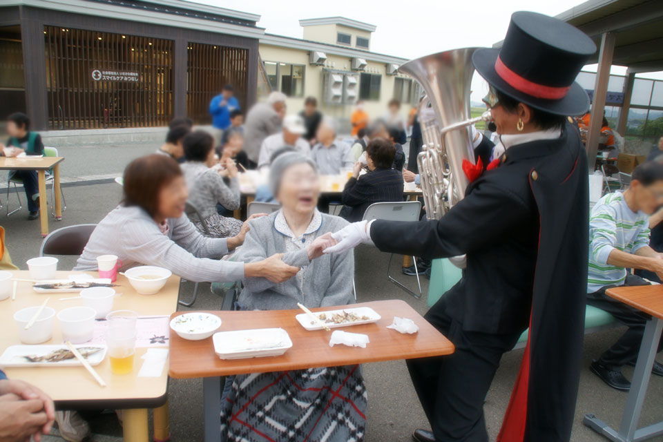 湯沢市三梨の高齢者施設「秋祭り」にお邪魔しました。 利用者さんのご家族はもちろん、近隣の方々も多数参加。 「稲庭うどん」や「さんま塩焼き」「いものこ汁」「わたがし」などが振舞われております!! ユーフォー仮面と握手で「10年元気に長生き!!」 ちびっこは「通信簿のマルがひとつ増える!!!」 お弁当と稲庭うどん、いただきました! ありがとうございます。 (≧▽≦) サービスショット ...スミマセン m(__)m