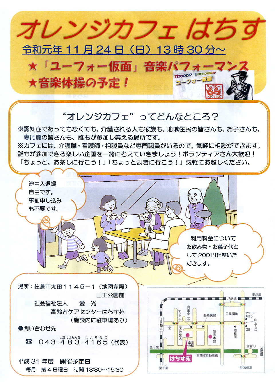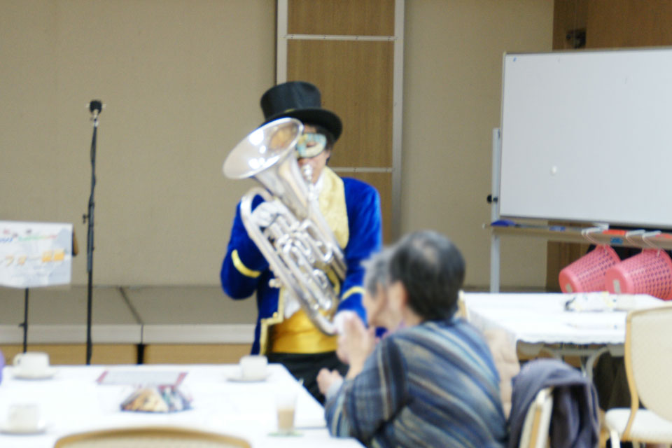 佐倉市の高齢者施設で開催の 《認知症予防 オレンジカフェ》 アトラクションにお声かけいただきました。 もちろん、吹き歩き・吹き握手はデフォルトで。。。 普段は歌なんか歌わないという方も歌を口ずさんでいたようで、 スタッフさんや周りの皆さんもビックリしていましたよ。 これぞ、ユーフォー仮面効果!!! 演奏後にいただいたオヤツ (´艸`*)