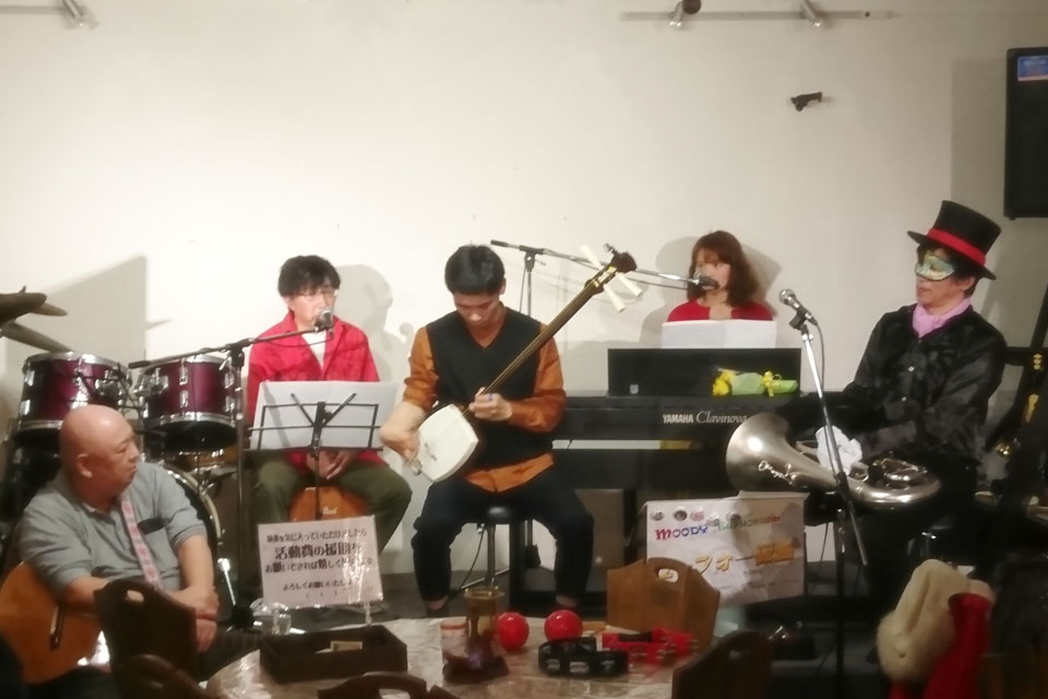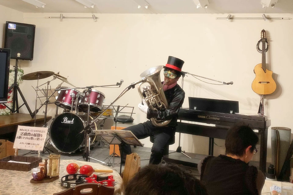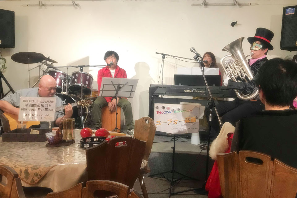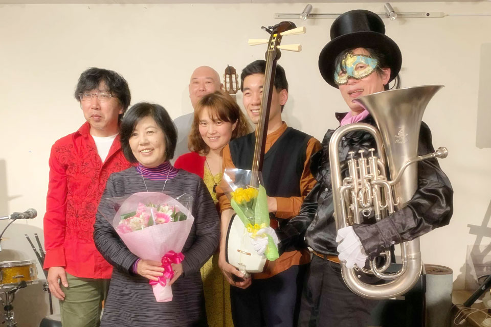 市原市五井の《ライブハウス&レストラン 萬花園》 隔月企画《ユーフォー仮面のムーディナイト》 5年目に突入です。 いつものユーフォー仮面ソロステージに続き ゲストの夫婦ユニット《ほっともっと》さんのステージ コラボステージでは お馴染みの《ROCKY》さん、《川上浩市》さんも参加してくださいました。 お誕生日のお友達にブーケのサプライズを仕掛けたら、 まさかのサプライズ!! ユーフォー仮面6歳(満6年)のお祝いにと、花束をいただきました!! ありがとうございます。