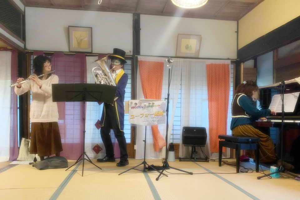 大網白里市の ベジタブルタイ料理の古民家レストラン 《ニコニコレストラン》さんにて 学習机コンサート(番外編) 開催! ちびっこちゃんは少なく、結果的には《大人の学習机コンサート》 管楽器とピアノのインスト そして大雨はショパンの調べ(笑)