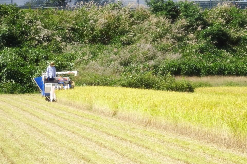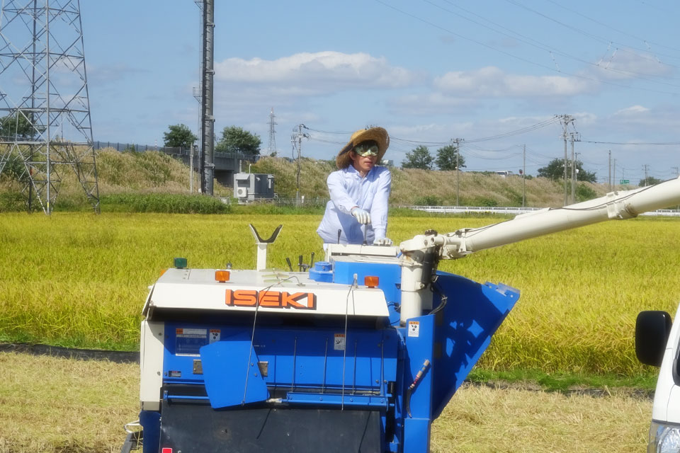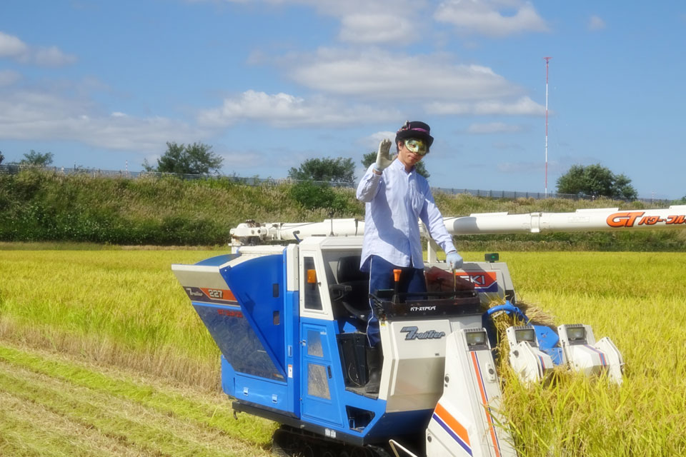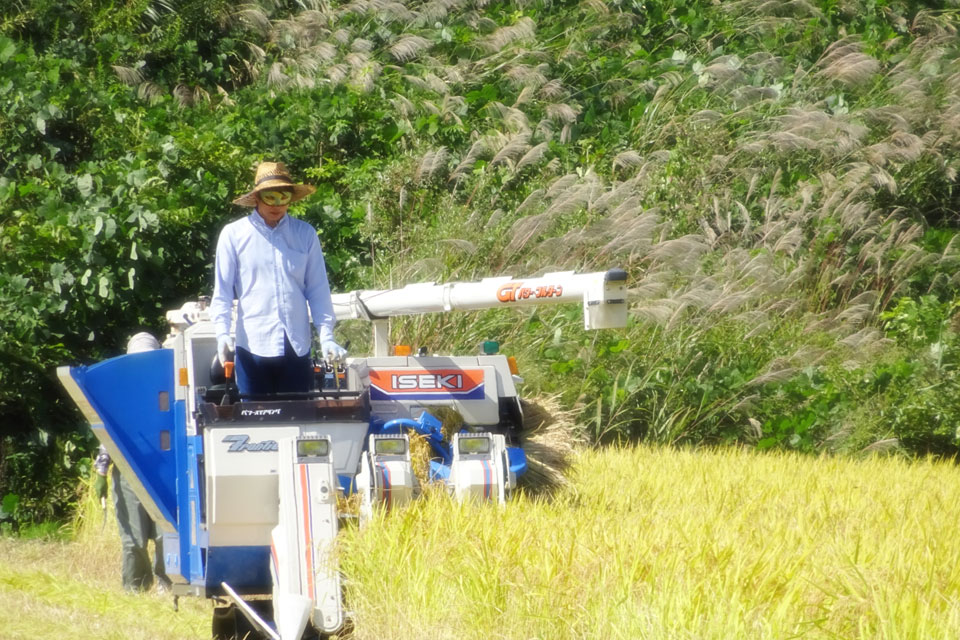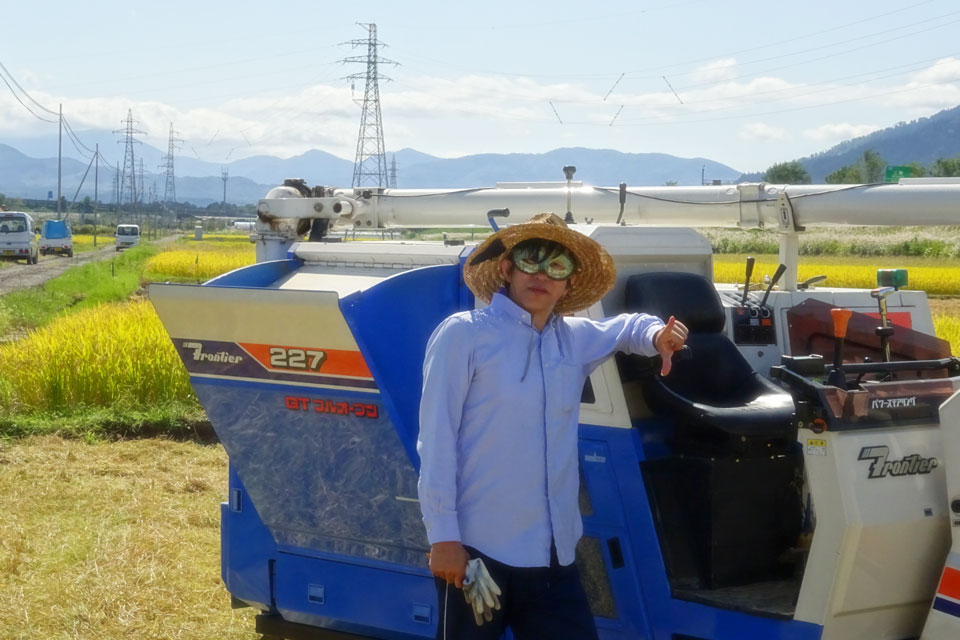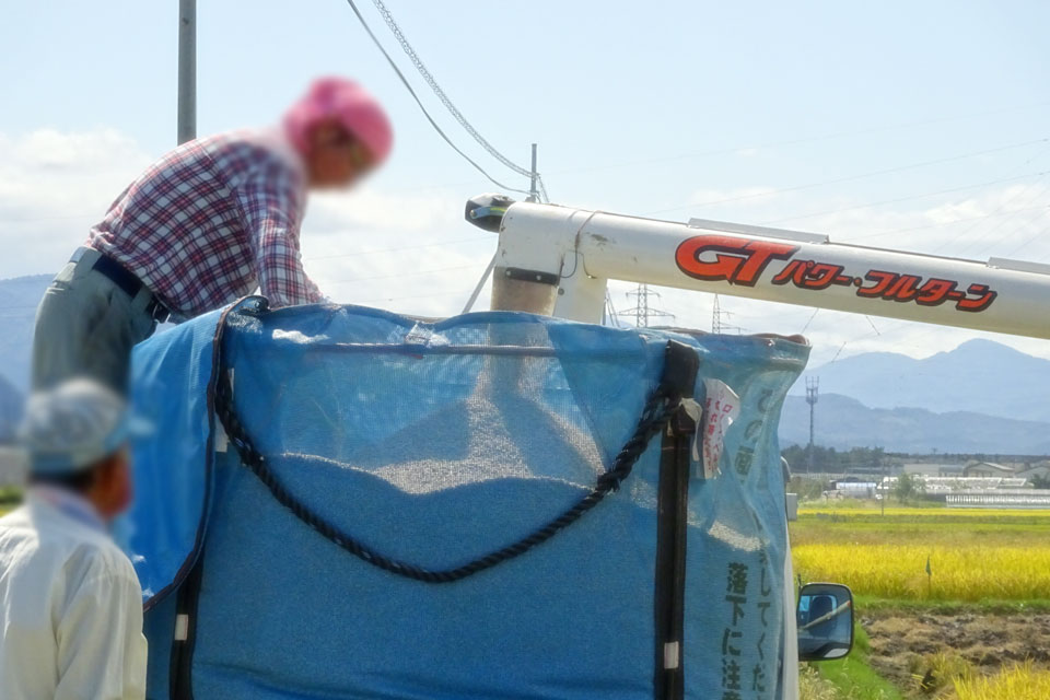 マネージャー氏の生家の稲刈り作業 ユーフォー仮面も コンバイン・パイロット!! 今年は機械トラブルもなし! このバッグで運搬します。 まだ途中だけど、ちょっとポーズとってみた