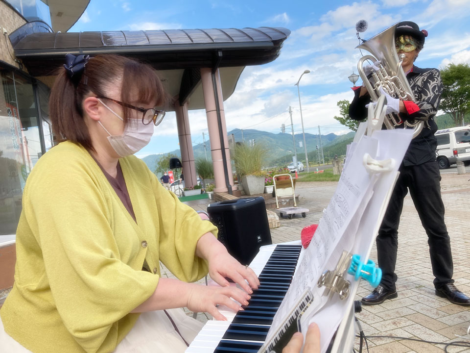 湯沢市「道の駅おがち 小町の郷」さんのイベント《うまいもの市》にお邪魔しました。 サプライズライブを仕掛けます。 ※もちろん、施設の許可はいただいております。 吹きながら、お蕎麦屋さんのお姉さんとタッチ!! 思いのほか暑かった... 💦 お客さまも、暑い中のご見物ありがとうございました。
