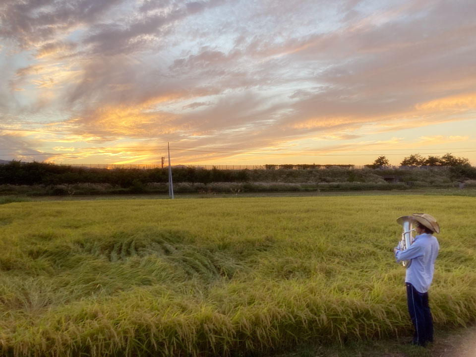 稲刈り前の稲たちに、ユーフォー仮面の演奏を聴かせます。