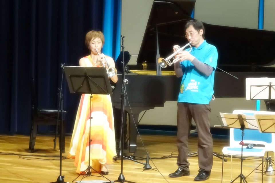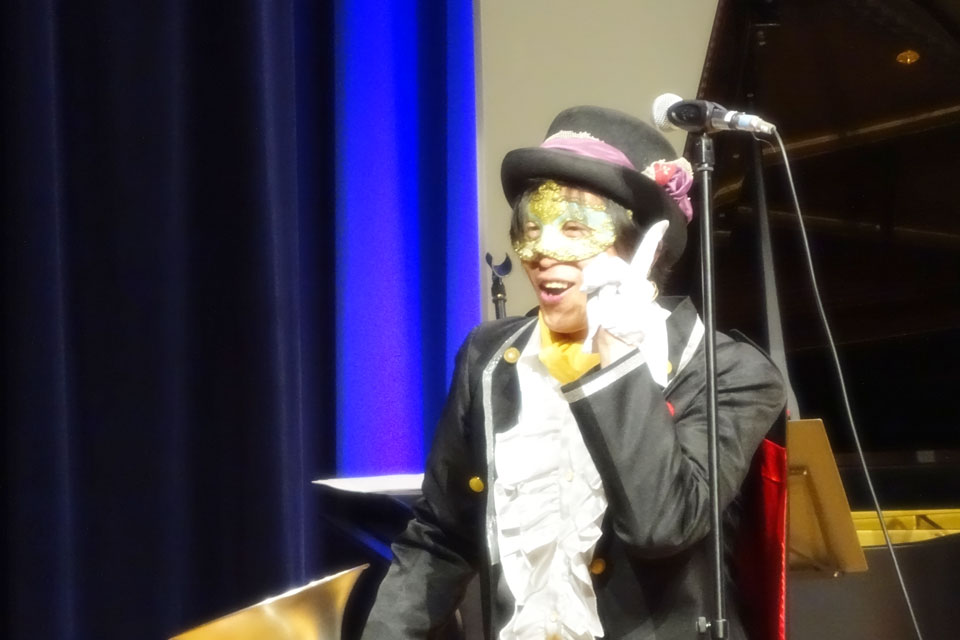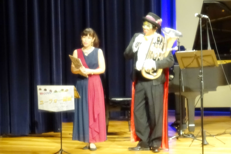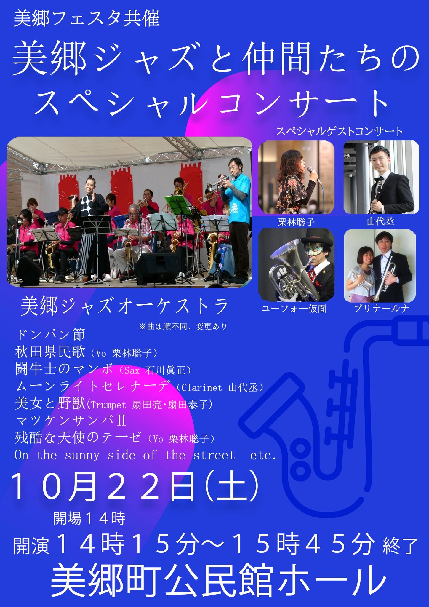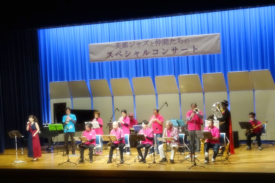 美郷町の《三郷町公民館》 美郷フェスタ共催 《美郷ジャズと仲間たちのスペシャルコンサート》 「仲間」に入れていただき、ありがとうございます!! 軽~く引き受けたら、思いのほか立派なホールでビックリ!! 歌手《栗林聡子》さんと漫才??? いつかやりましょうね。 アクション付き演奏 《プリナールナ》さん 《山城丞》さん、《栗林聡子》さん 《美郷ジャズ》全体演奏 ユーフォー仮面も まったく違和感なく...??? (≧▽≦)