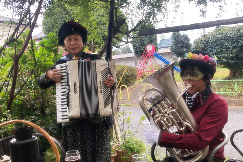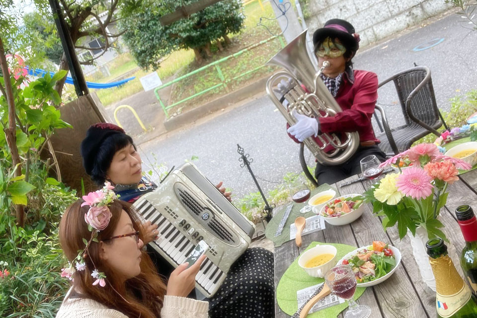 千葉市《アトリエガーデンLafee》 別名「妖精の家」 ガーデンパーティに出没しました。 エリーさんの創作料理と音楽を楽しむ会です。 とんでもなく美味しい!! ユーフォー仮面米(玄米)も採用いただきました! ゲスト楽士は《えちぜんゆり》さん & 《ユーフォー仮面》 お食事の後は室内に移動して音楽会~お茶会 ホストの《メーテル》さんも芸を披露しますよ。 ユーフォー仮面 & メーテルの鉄板ネタから... (≧▽≦) 画像にはないけど、お客様みんな芸達者な方々ばかり 歌えや踊れや... パーティは続きます。 デザート! 色が変わる 不思議なお茶 料理の《エリー》さんに、ユーフォー仮面米をプレゼント 美味しいご馳走ありがとうございました。 ありがとうございました。