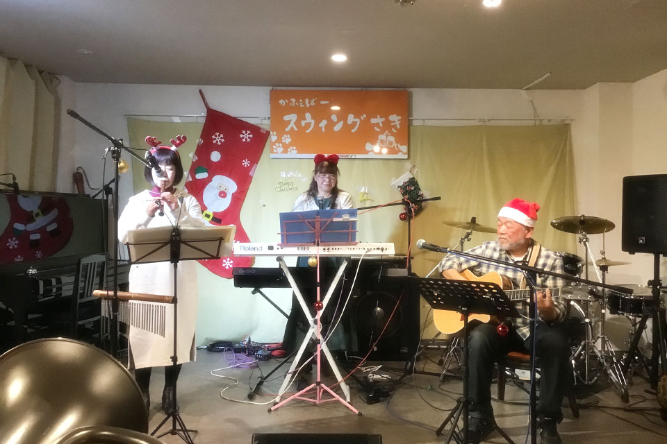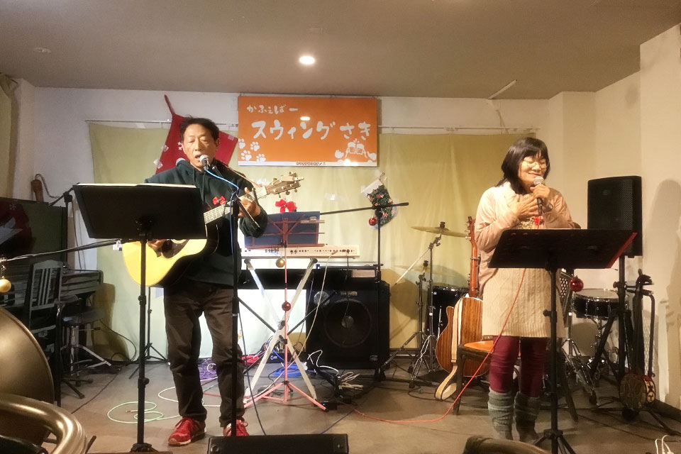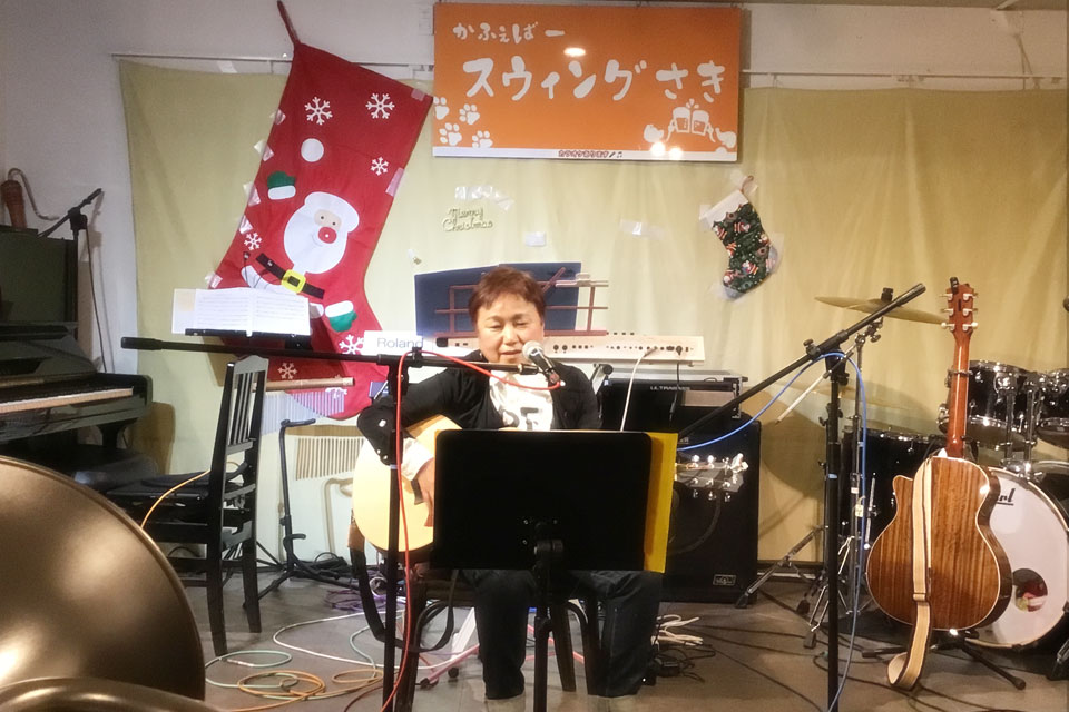 千葉市「新検見川」駅前 《スウィングさき》さんにお邪魔しました。 THE OPEN MIC Xmasなので、鈴なんかも鳴らしております。。 Xmasケーキもありますよ。 ホストの SHU&MACHIKO さん SHU&メーテル 豪華な出演者でした。 メーテルさんと2ショット撮ろうと思ったら 背後に... Mシェフによる「高菜と明太子のパスタ」 美味しかった~!! (≧▽≦) もろもろの事情により、お先に失礼しました。💦 この後も盛大に盛り上がったようです。。。