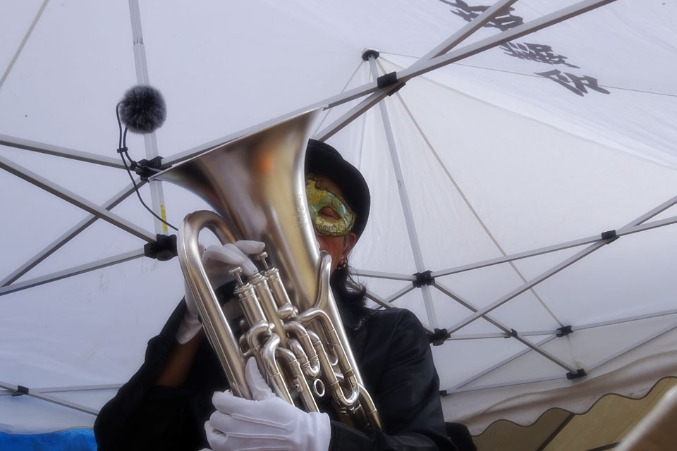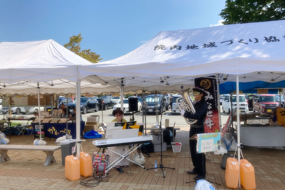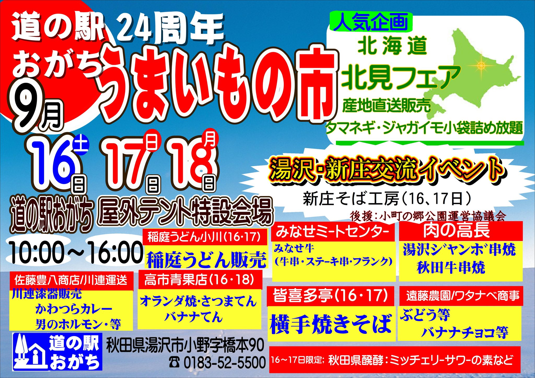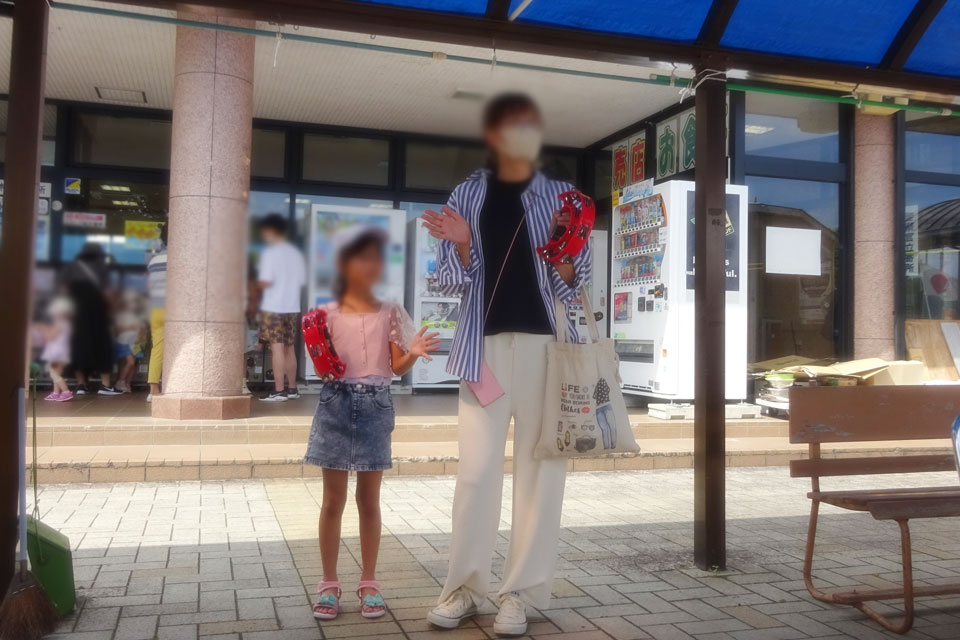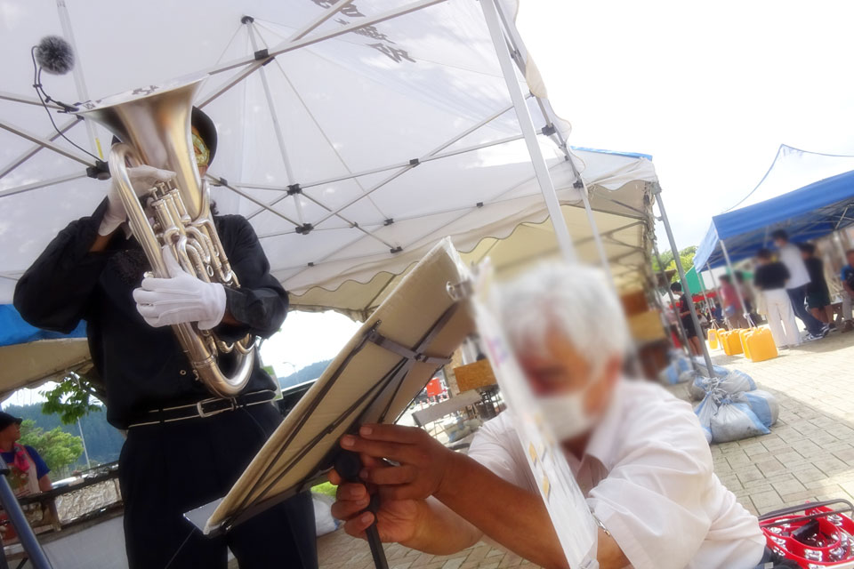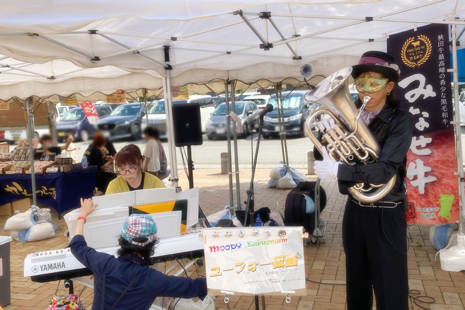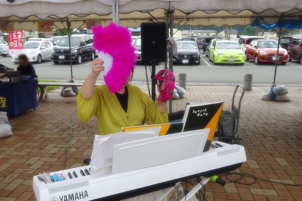 湯沢市《道の駅おがち 小町の郷》さんにお邪魔しました。 《うまいもの市》開催中!!! あまりの暑さに、空きテントの下をお借りしました。 スイッチ入れ忘れてたマイク...💦 タンブリンで参加いただいた、通りがかりのお嬢さんたち ❤ ゆきのん... いつの間にそんなアイテムを... ときどき強風... 譜面押さえ&譜面台押さえ お友達のIさま、営業部長、ありがとうございました。 ランチは屋台の「かきあげうどん」「月見そば」 そして「オランダ焼き」