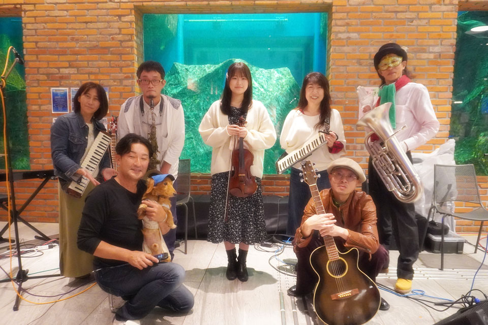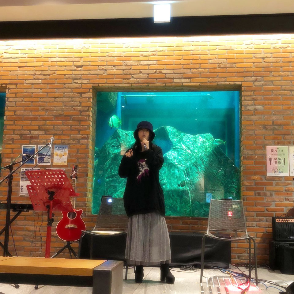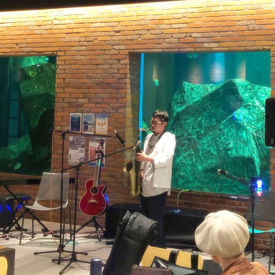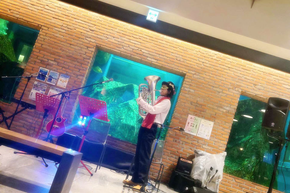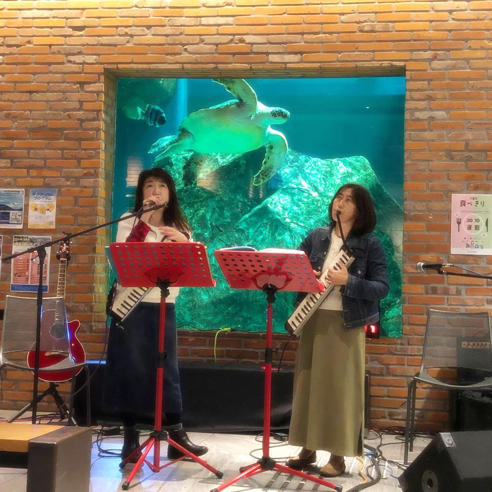 ウミガメやサメもいる巨大な水槽前がステージです。