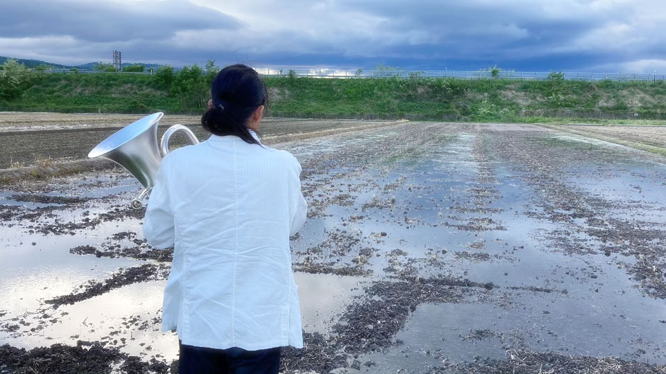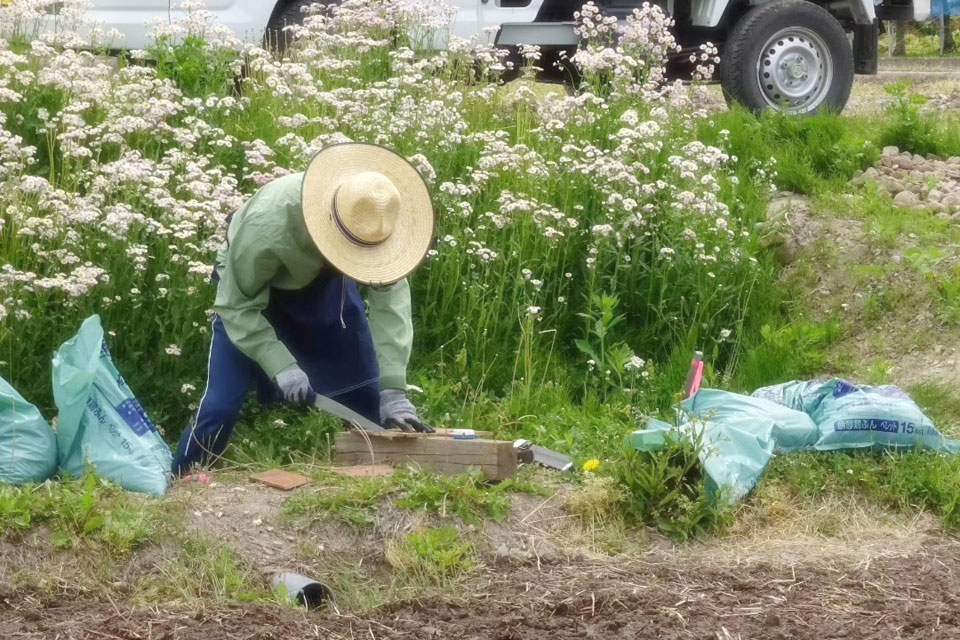 湯沢市《ユーフォー仮面田んぼ》 今シーズンはちょっと遅れて 《音の肥料作戦》 開始しました。。 この日は都合によりマネジャー氏が担当 マネジャー氏、DIYで治水工事(笑)もします。 水を張りはじめた田んぼには シオカラトンボもやってきましたよ!!
