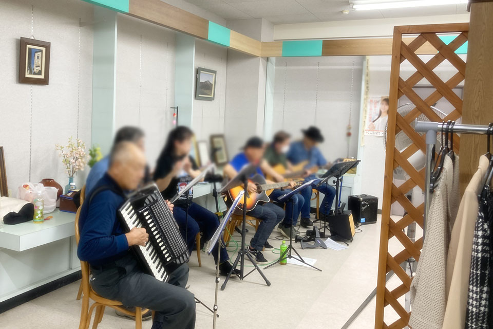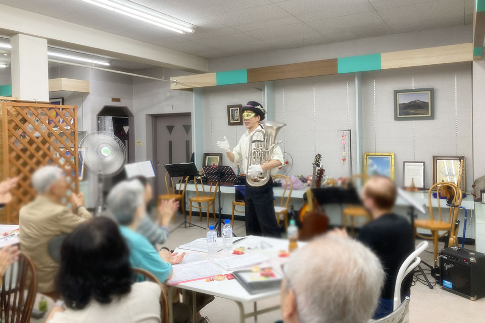 湯沢市の老舗セトモノ屋さん《カクトとみや》さん 店の奥のカフェスペースで開催の 《湯沢歌声広場》 歌の合間にゲスト出演しました。 アンコールまでいただき、ありがとうございます。 この歌声サークル、伴奏も豪華なんです!! この6人の楽士の演奏で歌を歌います。 ユーフォー仮面の登場で火がついたのは、この楽士さんたち ユーフォー仮面が演奏した曲目を即興でやりはじめましたよ。(笑) 今日の曲目リストには入っていないはずなのに。。。