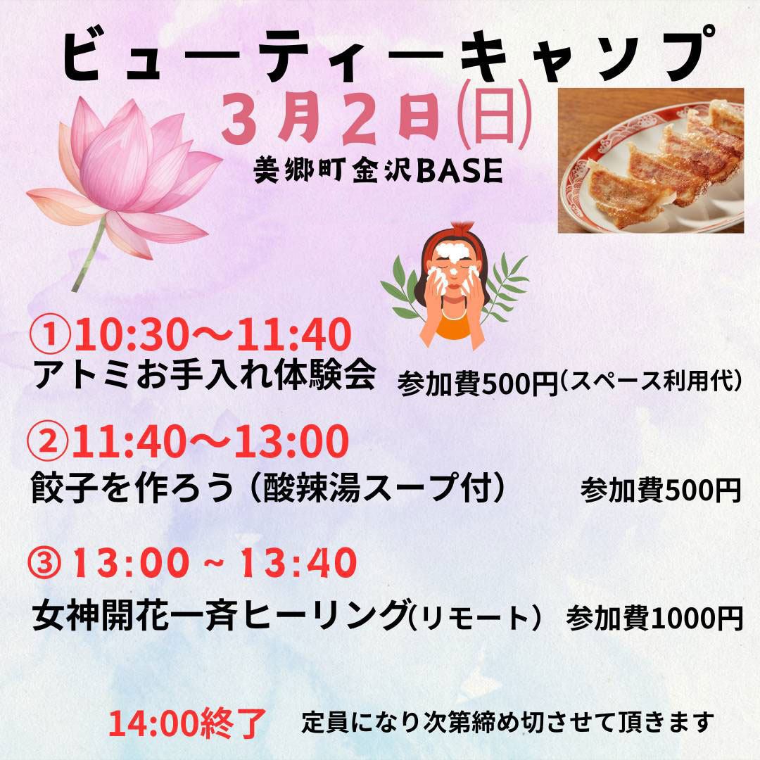 秋田県美郷町《金沢BASE》で開催の 自愛イベント 《ビューティキャンプ》で zoomリモートヒーリングを行いました。 横になっていただき リモートでチャクラを整え、お腹を温めていきます。 みんな、お手入れの途中で 顔をパックしたまま受けていただきました。(笑) 白塗り、けっこう怖いので(笑)モザイク処理しました。(≧▽≦) このピースサイン 自己肯定感、UPしたかな?? ありがとうございました。
