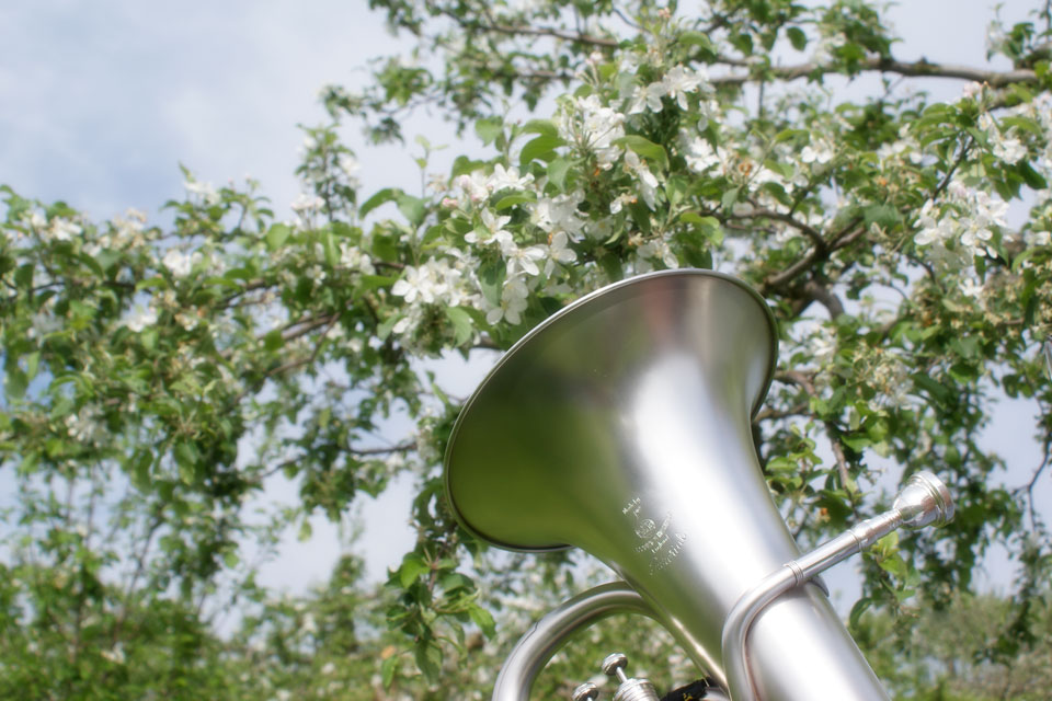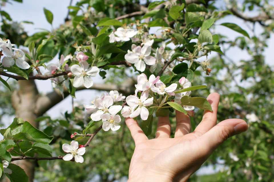 「ユーフォー仮面りんご」の花たちに《音の肥料作戦》です。