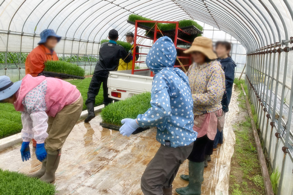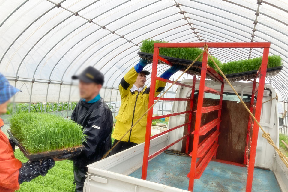 マネジャー氏 雨の中、田植えの準備(苗配り)に行ってきました。 苗代で育てた苗を、植える田んぼの脇に運んで並べて置く作業です。 専用のラックに積み込み 身長のあるマネージャー氏は高所積み降ろし要員(笑) 田んぼの脇で降ろして並べておきます。 一般的には1~3人程度で行う作業に これだけの大人数!! (≧▽≦) オヤツも賑やか (≧▽≦) 圃場と圃場の間は 人も軽トラックで移動 ※公道ではNGですよ!※ 軽トラックの荷台に乗って楽しそうな女子たち (≧▽≦) おつかれさまでした。 明日は田植え作業です。