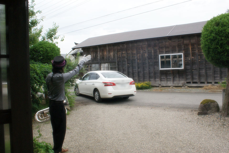 お客様をお見送りするユーフォー仮面