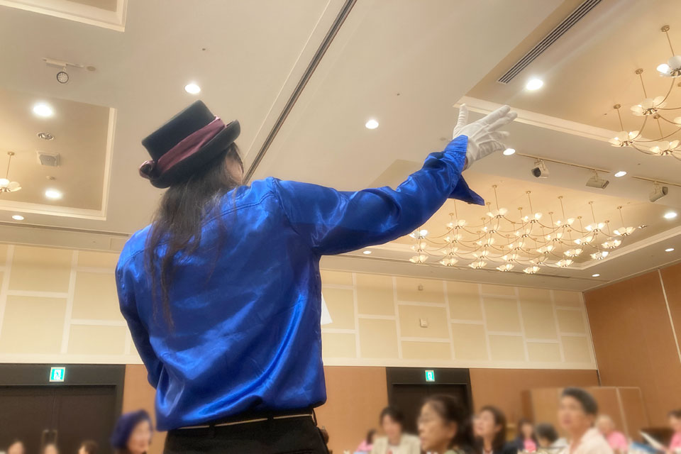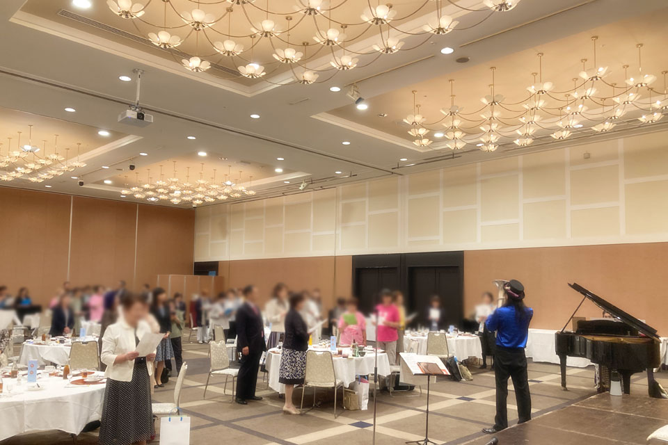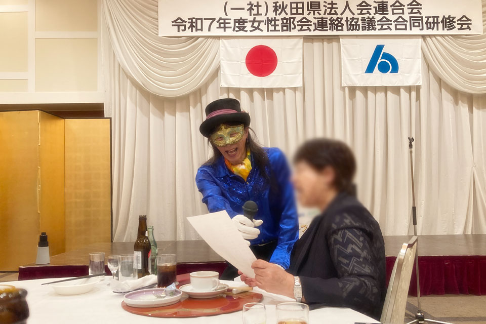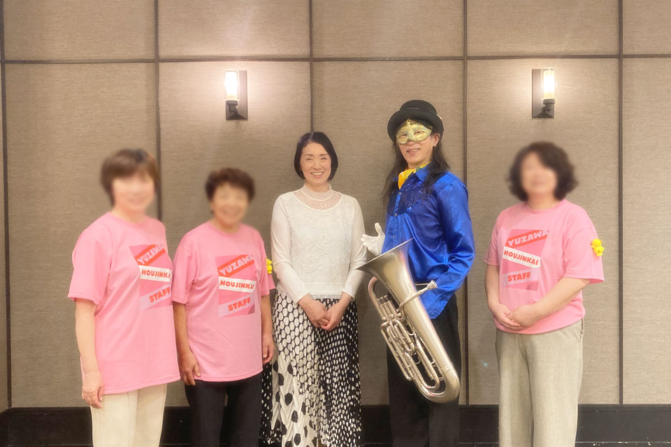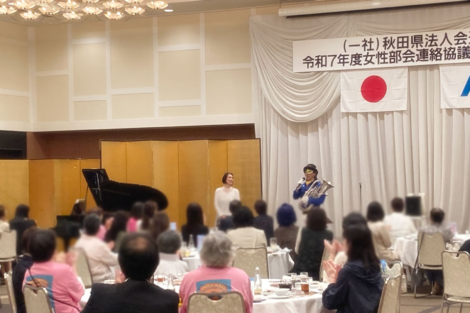湯沢市《湯沢グランドホテル》で開催の 《秋田県法人会連合会 女性部会連絡協議会 合同研修会》 アトラクションにお声かけいただきました。 今回の相方は 鈴木智子さん ありがとうございます。 ピアノ伴奏・カラオケ伴奏を取り混ぜて演奏します。 歌も歌います。 最後は「秋田県法人会連合会」らしく 「秋田県民歌」を合唱 ユーフォー仮面も 旋律や伴奏でリードします。 ありがとうございました。 スタッフの皆さんはおそろいのピンクのTシャツで ありがとうございます。
