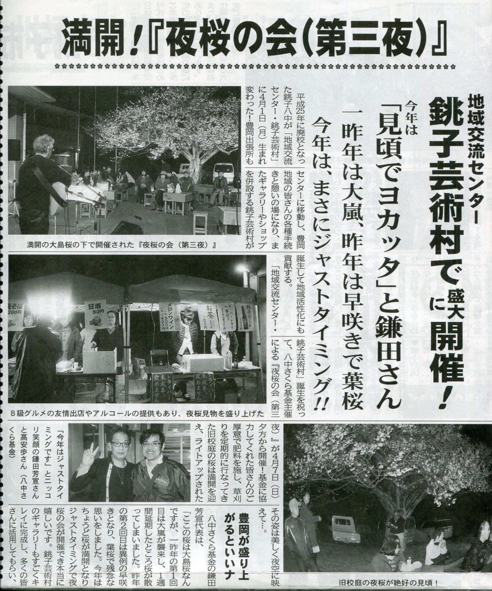 千葉県銚子市の新聞「大衆日報」さんの紙面にお邪魔しました。 4/7(日)に開催された《夜桜の会》の記事です。 こちらは主催者の《八中さくら基金》 鎌田さん&高安さん おつかれさまでした。 & ありがとうございました。